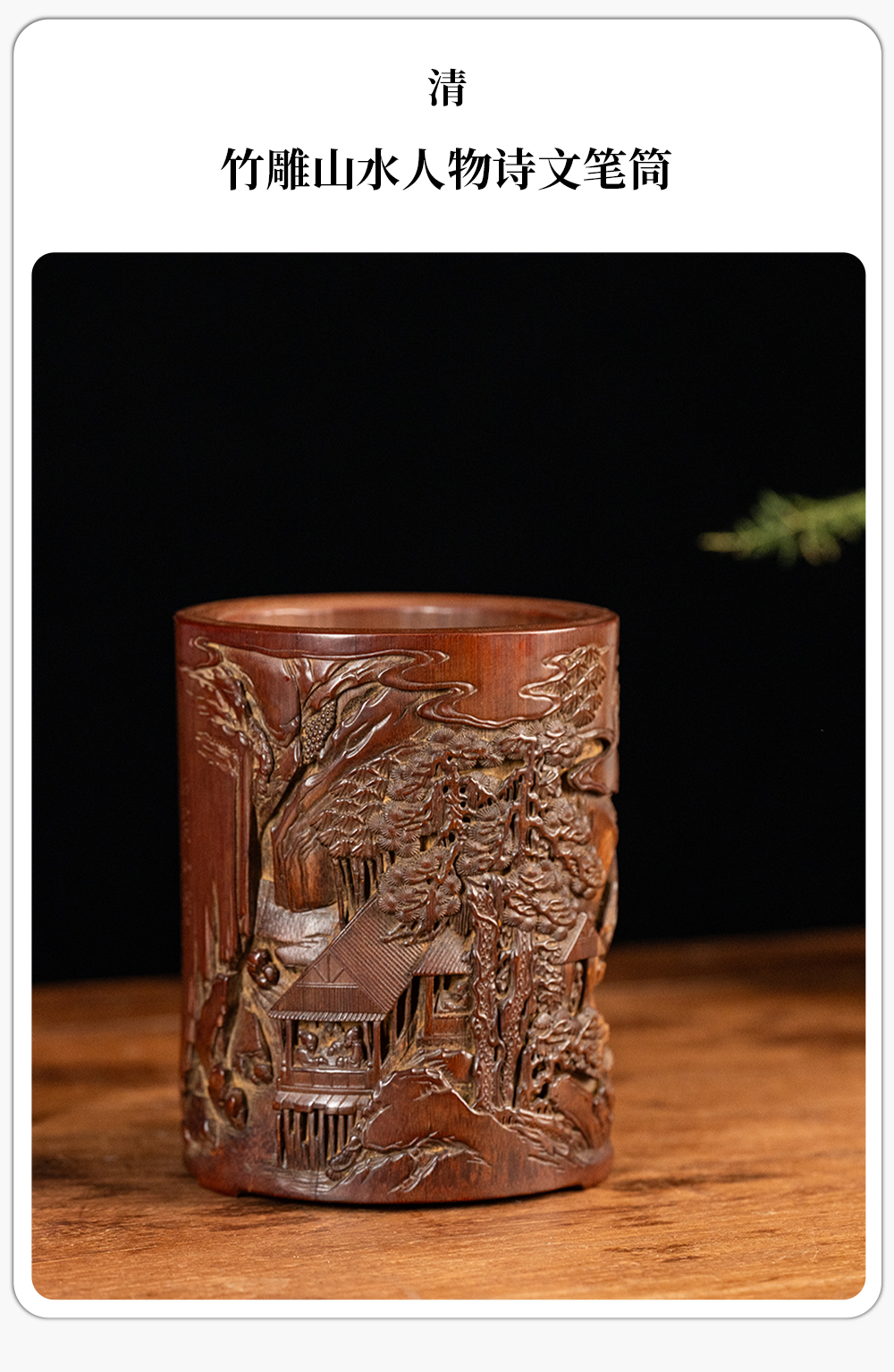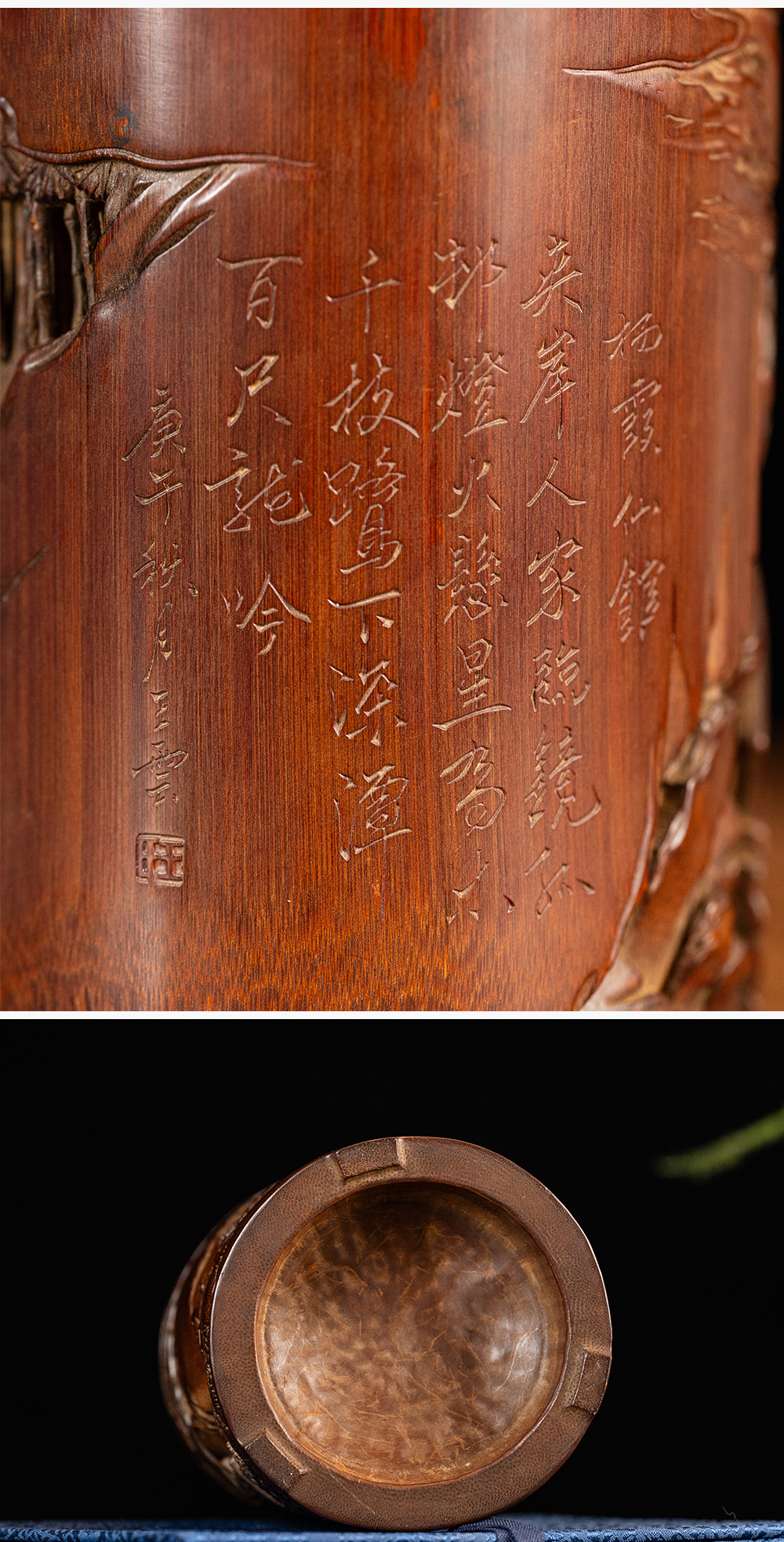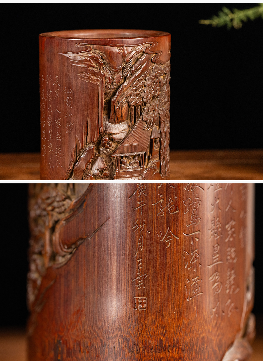 清 黄花梨百宝嵌花鸟诗文笔筒
