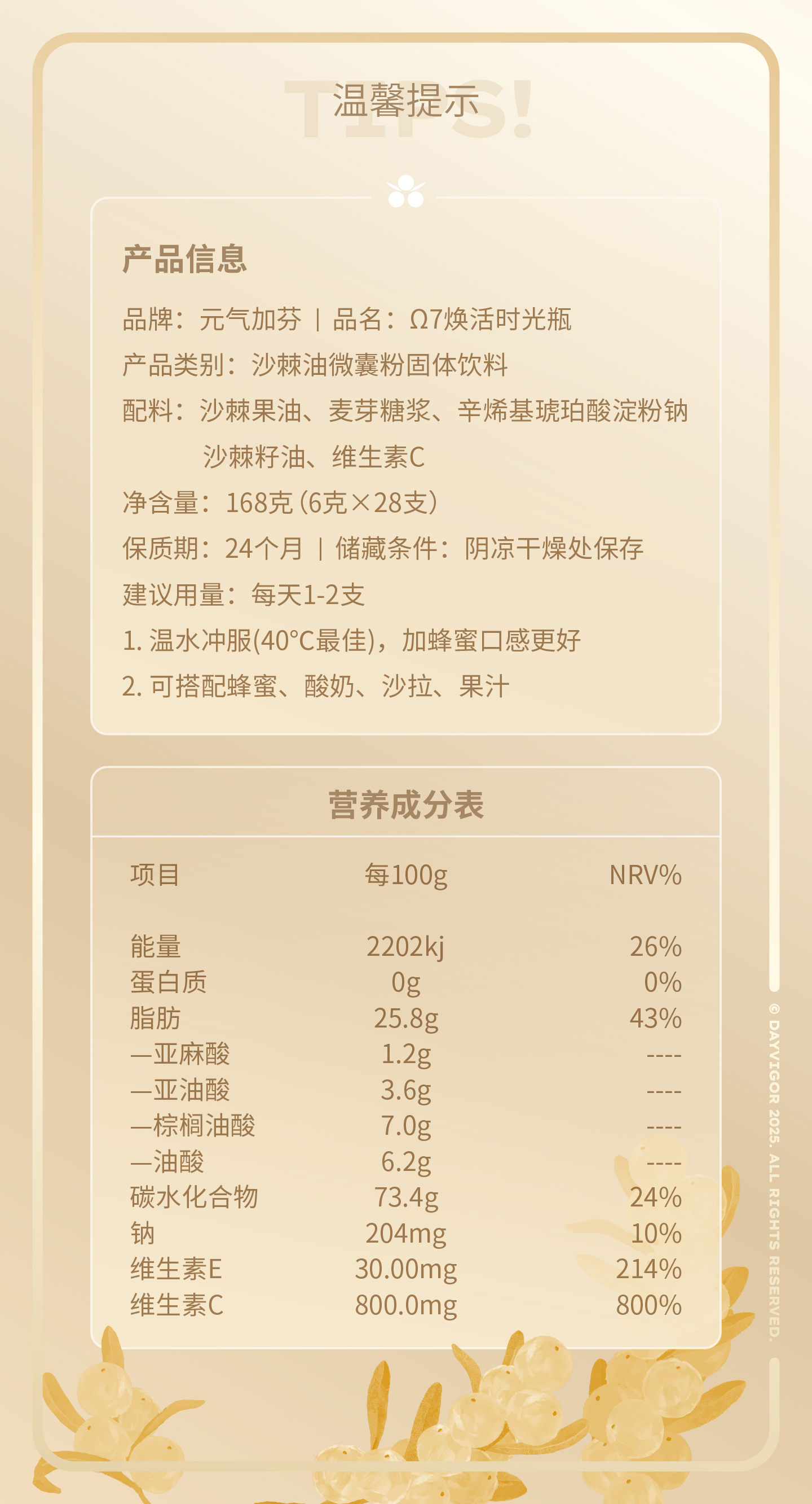Ω7焕活时光瓶,沙棘油微囊粉固体饮料168克(6克×28支)