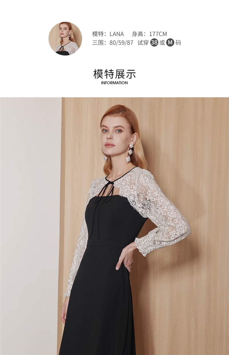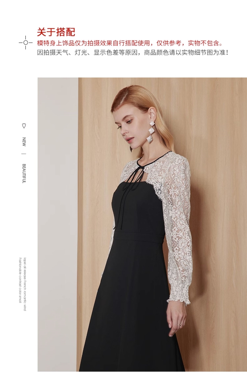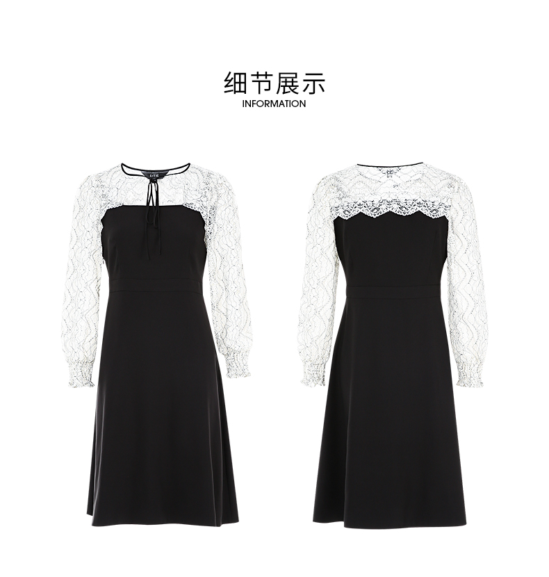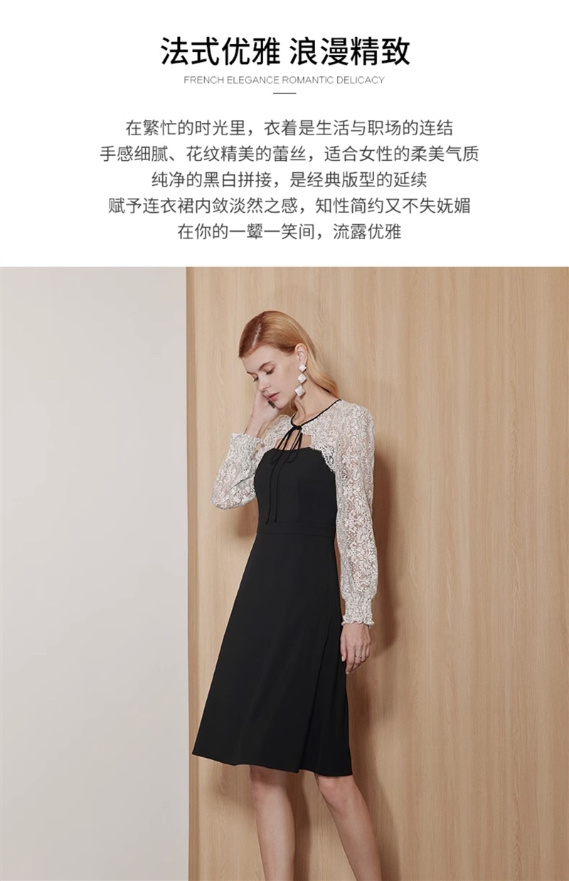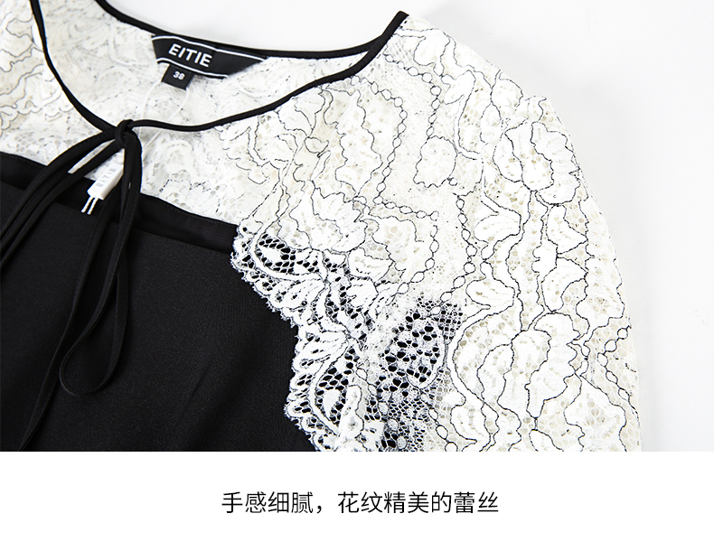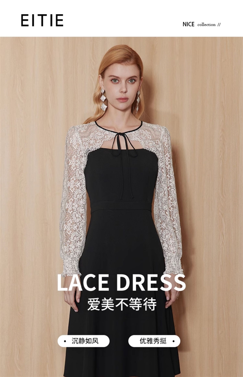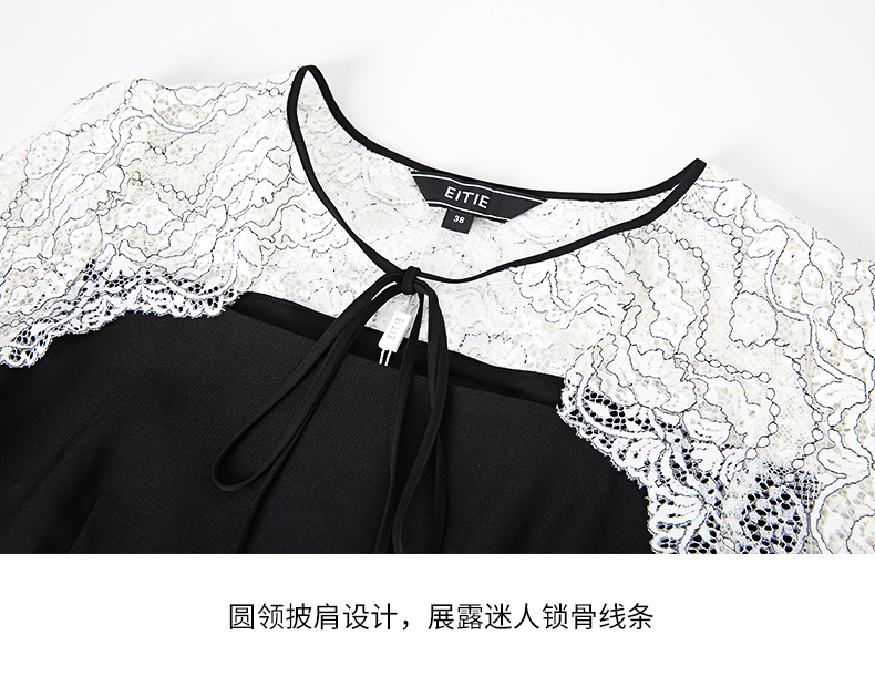 EITIE爱特爱法式蕾丝拼接假两件系带抹胸收腰黑色连衣裙秋新款C2307226