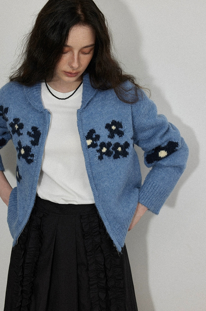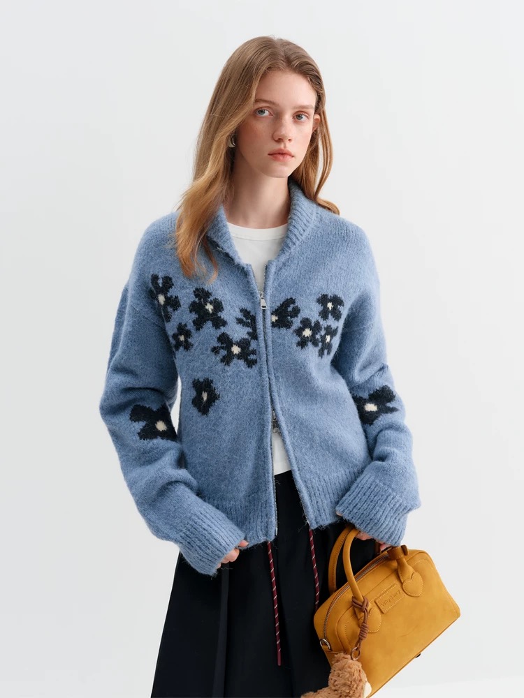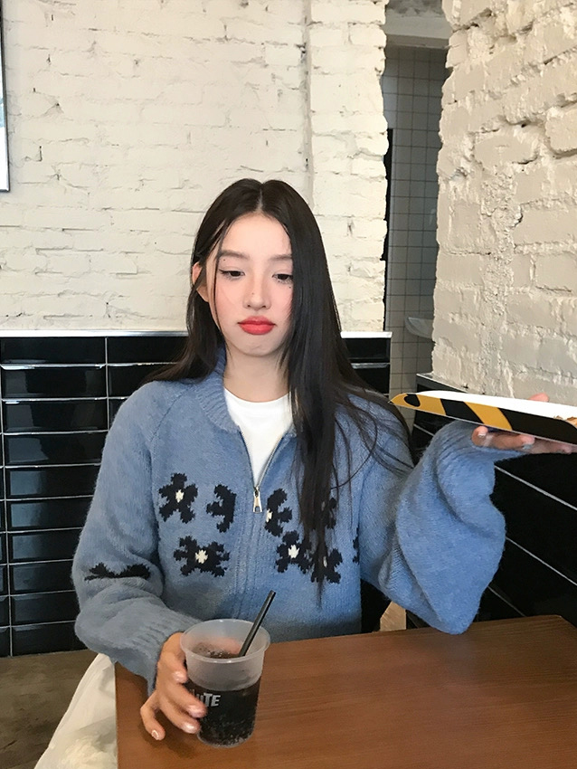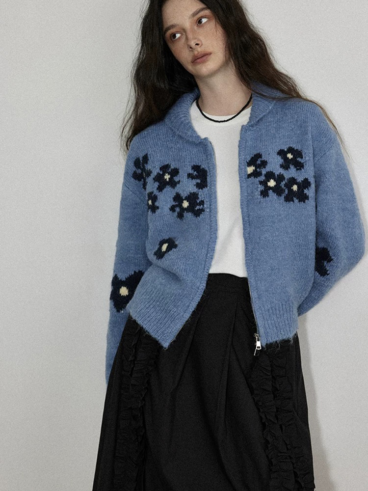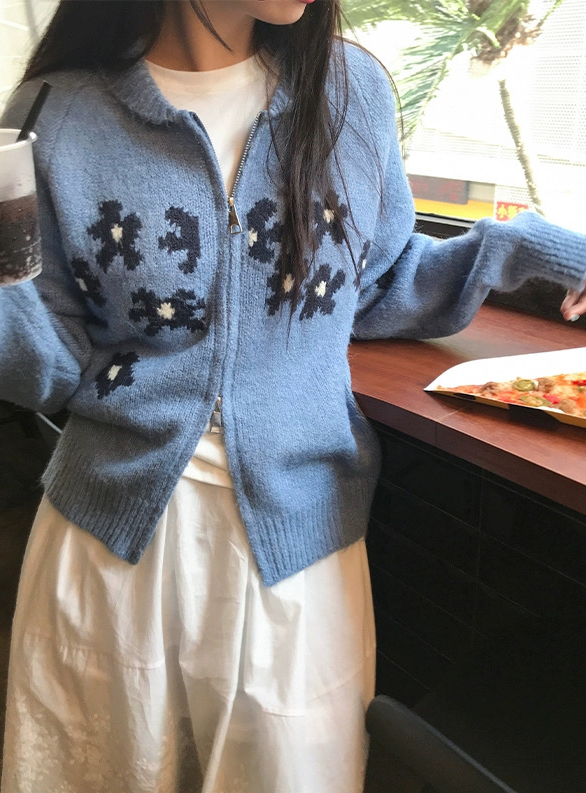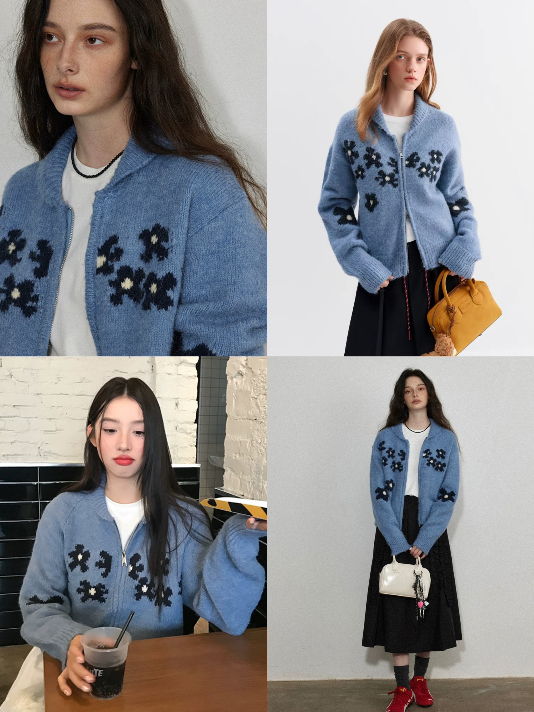 爆款3-5天发货!cos风雾霾蓝 法式浪漫设计感钩花花朵拉链开衫毛衣外套 M9130