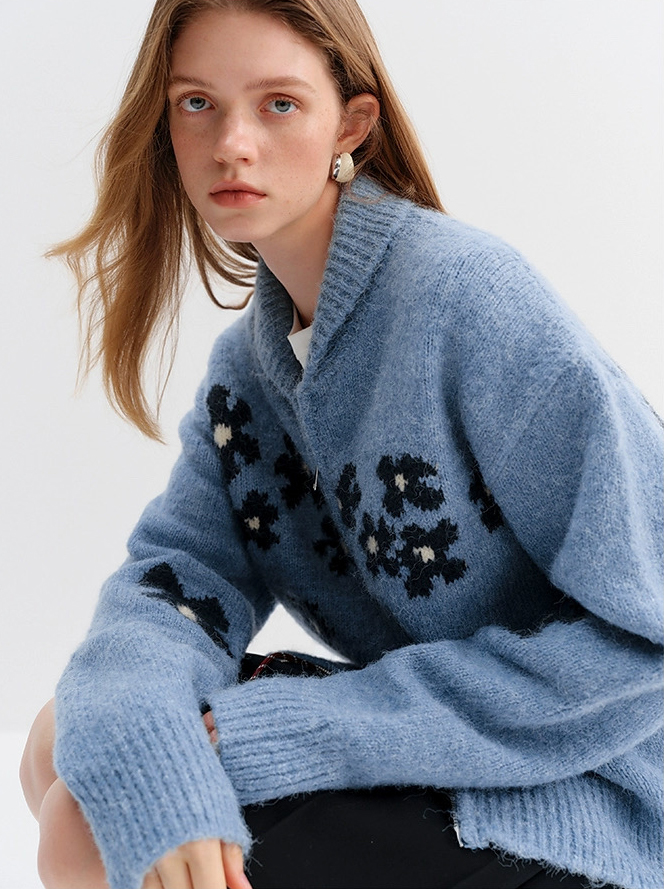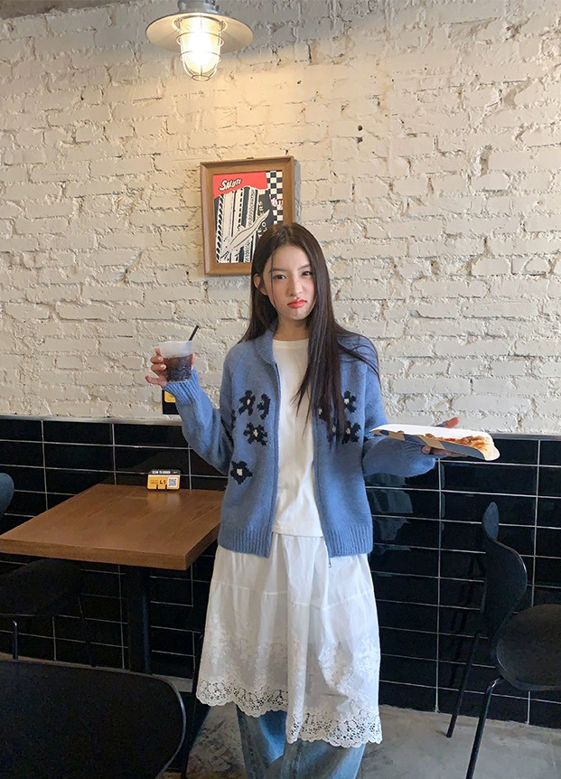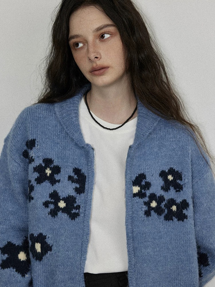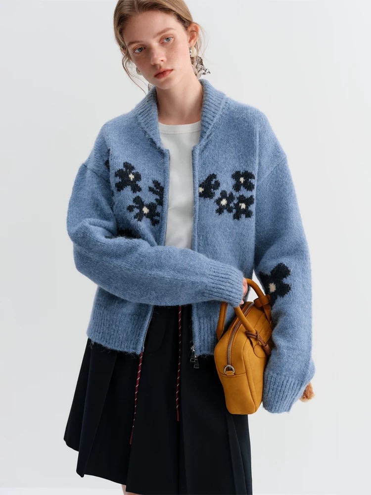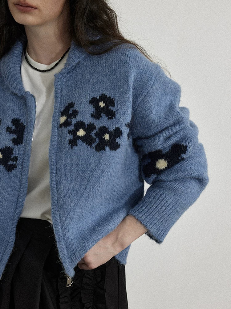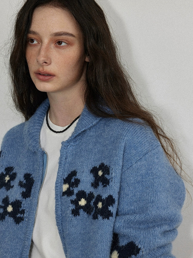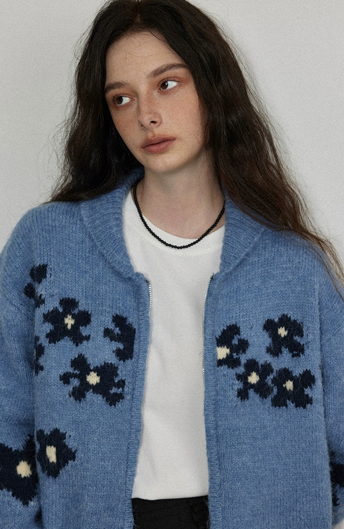 爆款3-5天发货!cos风雾霾蓝 法式浪漫设计感钩花花朵拉链开衫毛衣外套 M9130