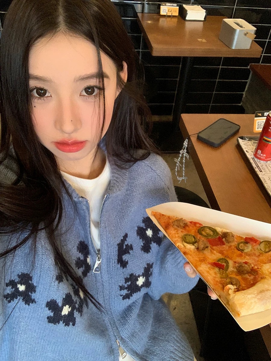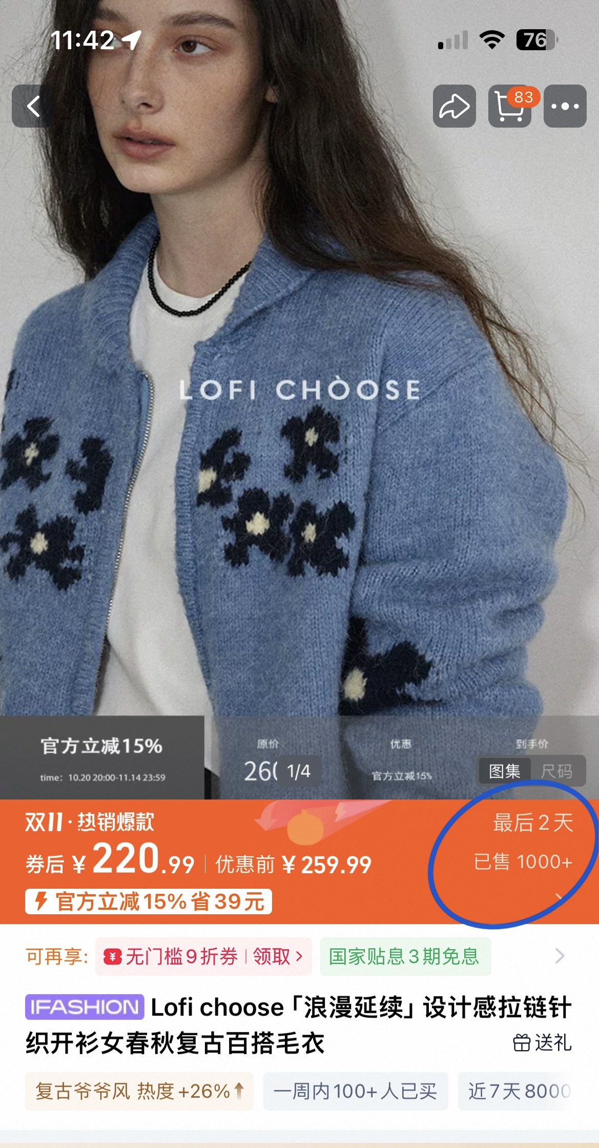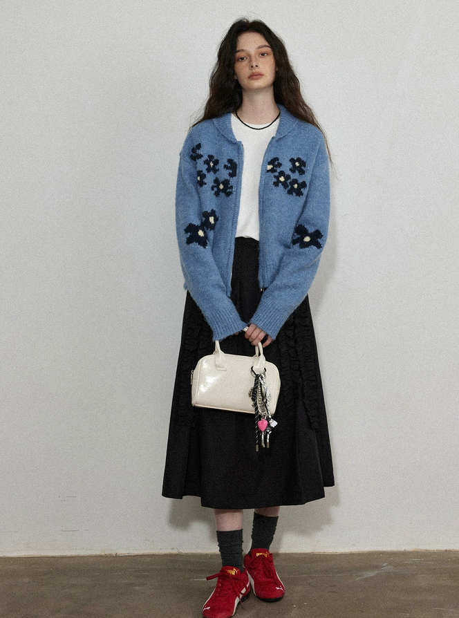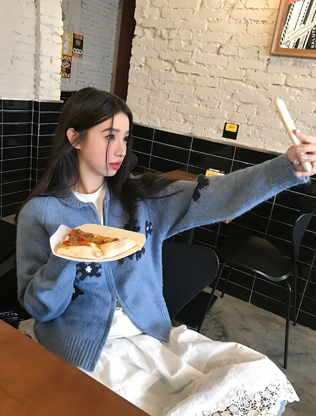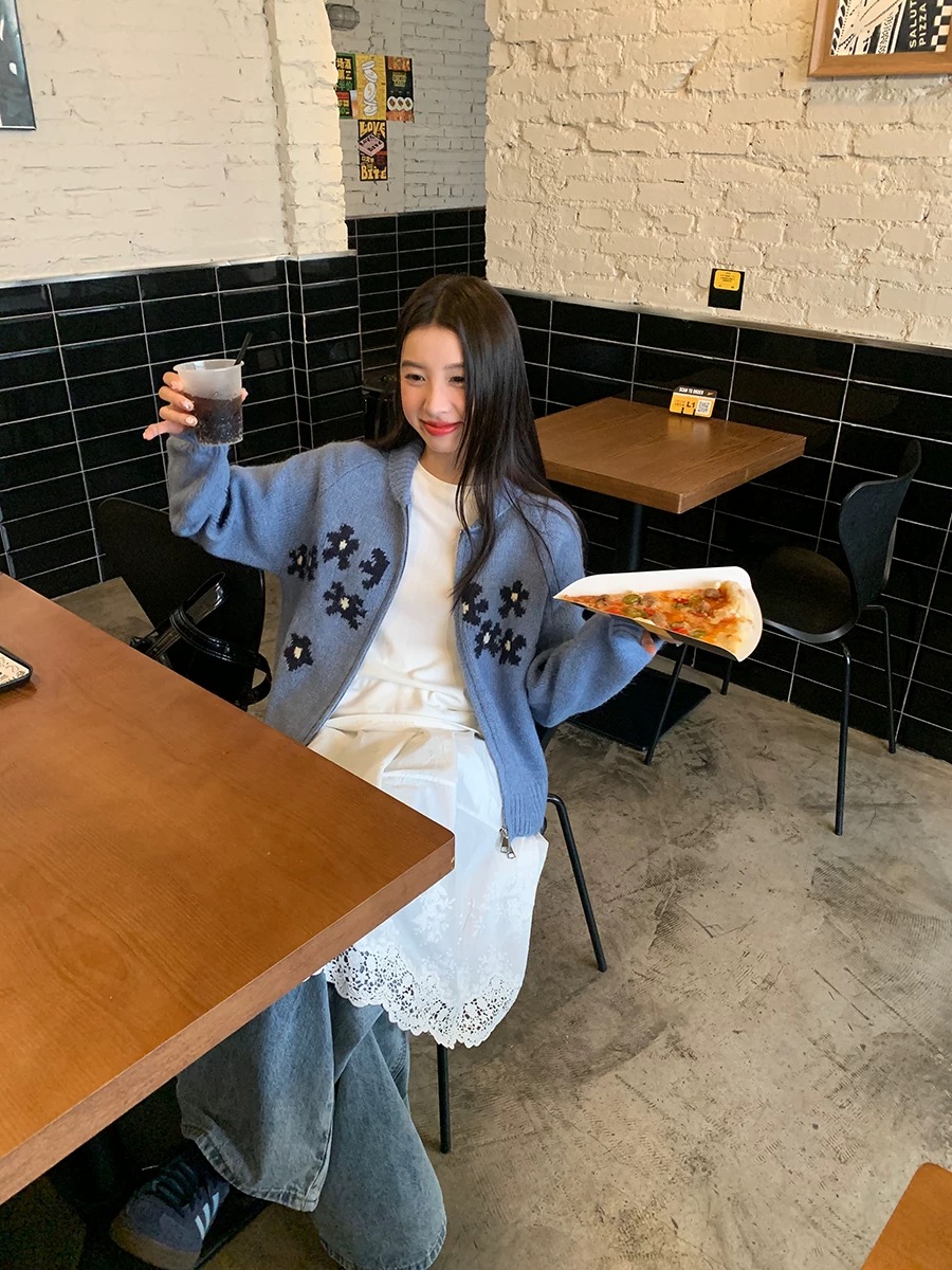 爆款3-5天发货!cos风雾霾蓝 法式浪漫设计感钩花花朵拉链开衫毛衣外套 M9130
