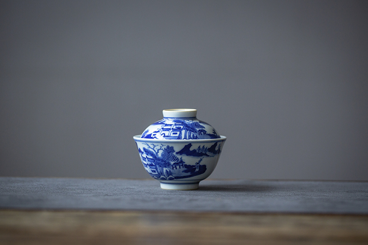 茶香记 仿古民国风格 手绘青花 缠枝 山水居 冰梅开窗盖碗 寒窑”款复刻