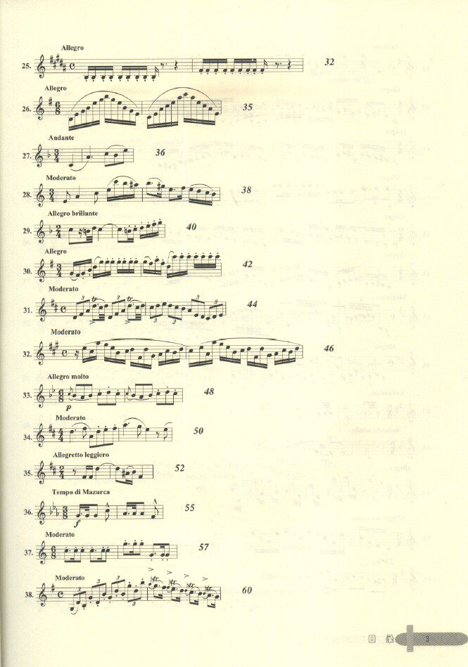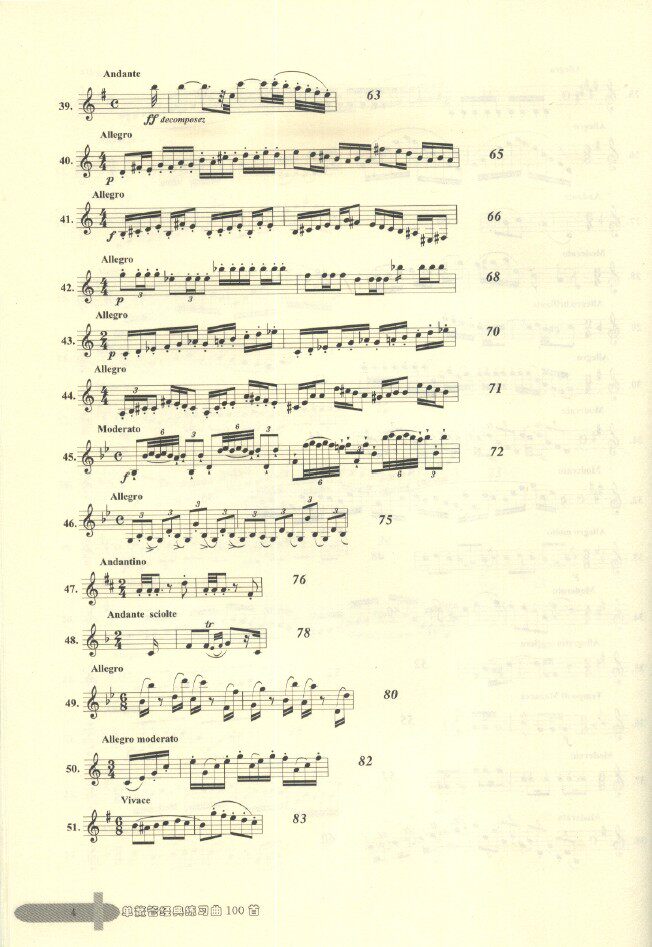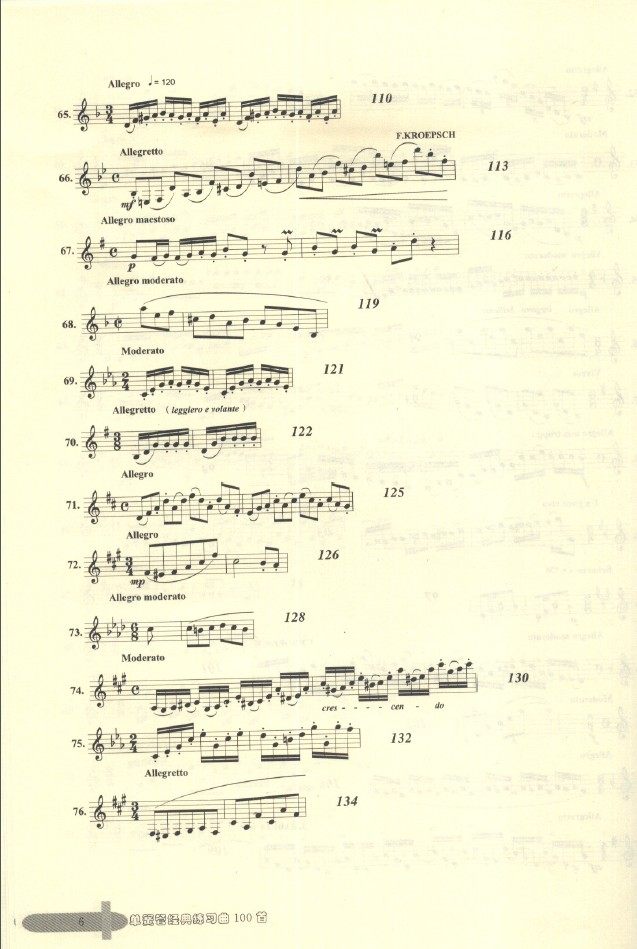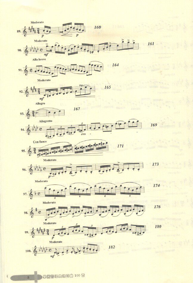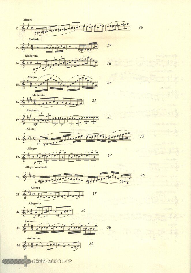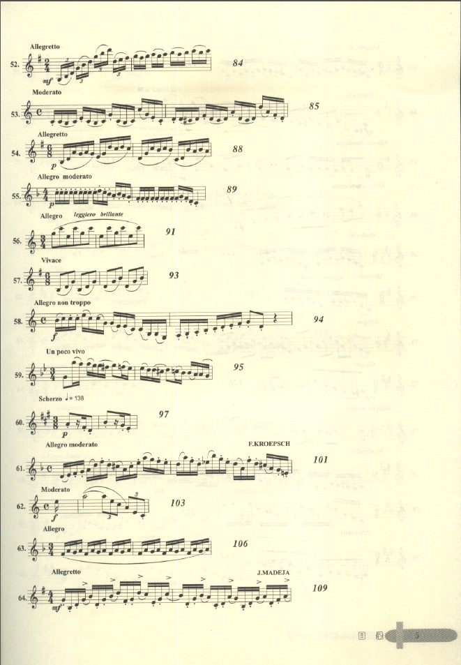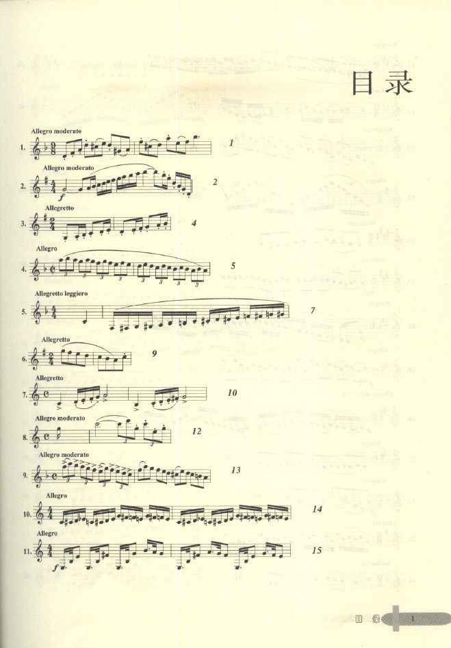 本书是训练单簧管基本功的教材,有三大类练习类别:(1)带旋律性的练习,如卡瓦尼里30首随想曲,保尔一让让16、18首练习曲以及洛斯32首练习曲等,(2)音阶性的练习:如克洛浦什416首日常练习、兰格音阶练习等,(3)技术性练习,这里又分古典的与现代的练习曲,古典的基本上都是有调式与调性,如克洛捷、克洛浦什、韦德曼等,现代练习曲一般都是无调性、现代和声进行或全音阶式,如保尔一让让部分练习、乌尔48首练习等。整体练习曲几乎将单簧管应该掌握的基本技巧都涵盖进去了,如节奏、演奏规格、大跳、断音、运指等训练。