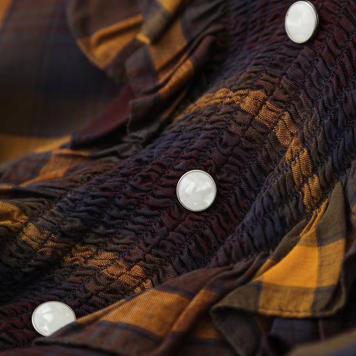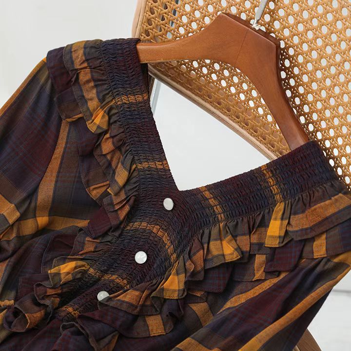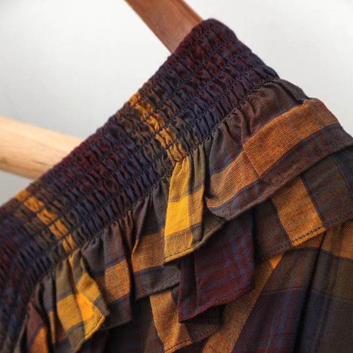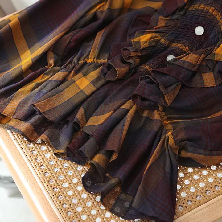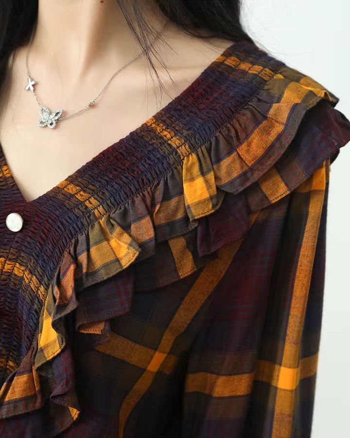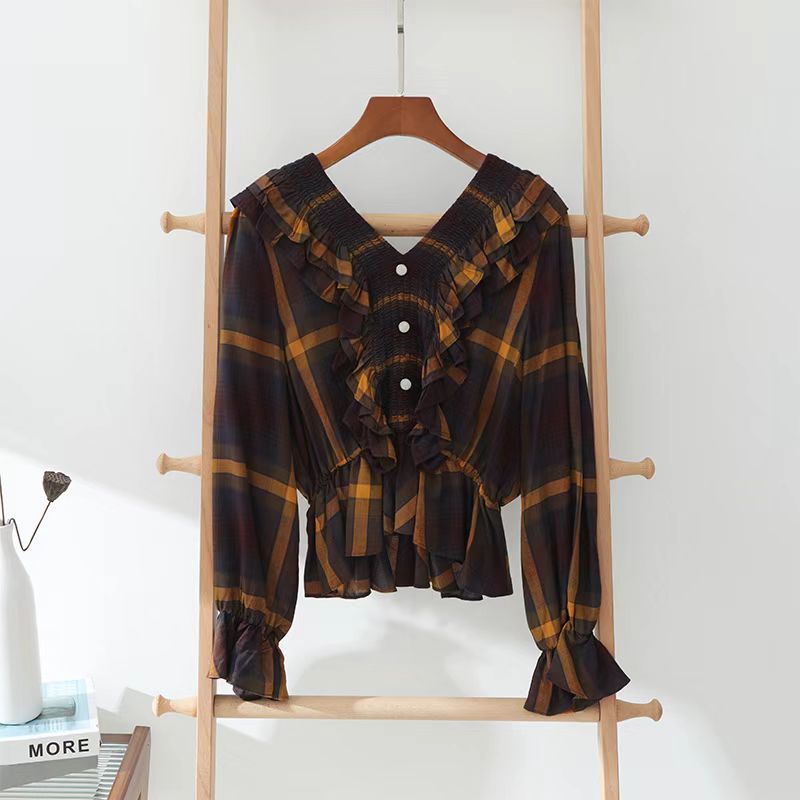 顺丰包邮洛诗琳40836法式文艺彩色格子荷叶边纯棉上衣10063