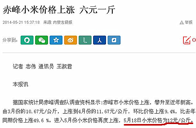 (上图)内蒙古晨报刊发国家统计局统计数据,2014年5月份内蒙主产区小米一斤价格已经超过6元。按照近几年的物价,优质的黄金生态小米价格已经超过15元1斤。