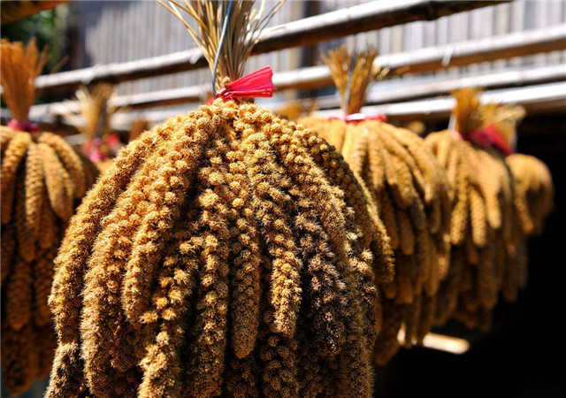(上图)为了更好的晾晒,有些谷穗需要扎起来继续晾晒,以免发霉影响小米的品质和口感。