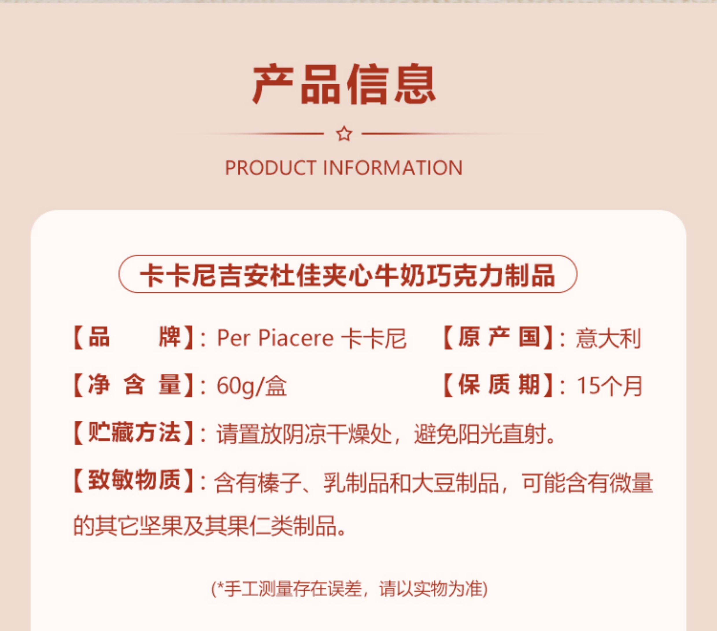意大利卡卡尼吉安杜佳夹心牛奶巧克力制品60g(颜色随机)