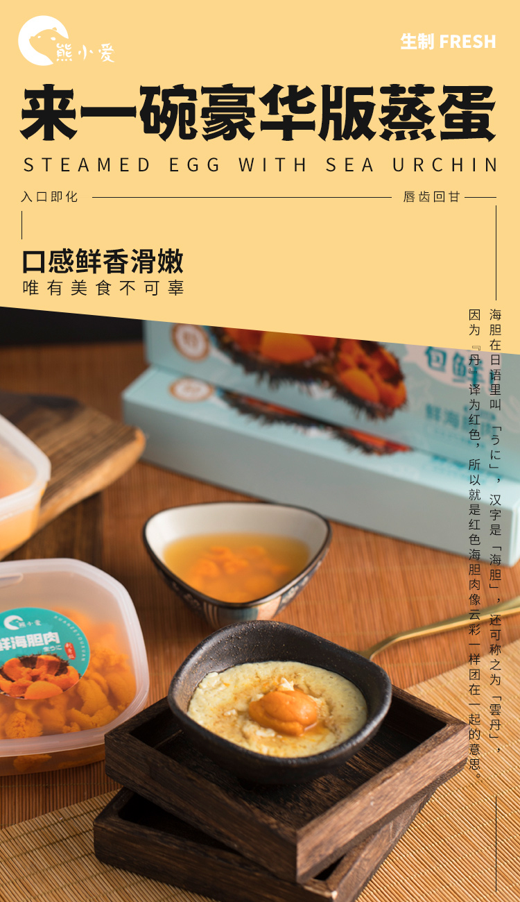 海胆口感鲜甜,肉质肥嫩,颜色也非常漂亮,熊小爱鲜海胆肉,来自大连的美味,大连位于黄渤海交汇处,水温比南方要低所以大连的所有的海鲜无论是肉质还是口感都更鲜美。