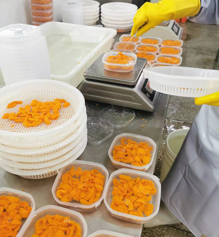 水盒海胆最显著的特点就是它不仅最大限度的保留了海胆的原汁原味——“鲜”,而且还保留了海胆的营养物质。因为水盒海胆的原材料就只有鲜活的海胆,经过破壳-挖肉-捡脏-放入水盒。在整个加工过程中,无论是用水、工器具还是工人的劳保用品全部经过消毒处理,从而保证产品从源头开始就是安全、卫生、高品质的生鲜海胆制品。