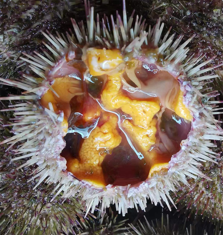 虽然个体较小但生殖腺十分厚实,鲜味很足,味型丰富,通常甘甜度很高,属于较高品质的海胆,马粪海胆生殖腺的营养成分含量丰富,而且口感鲜嫩,因此还被誉为海胆里的“牛排”。