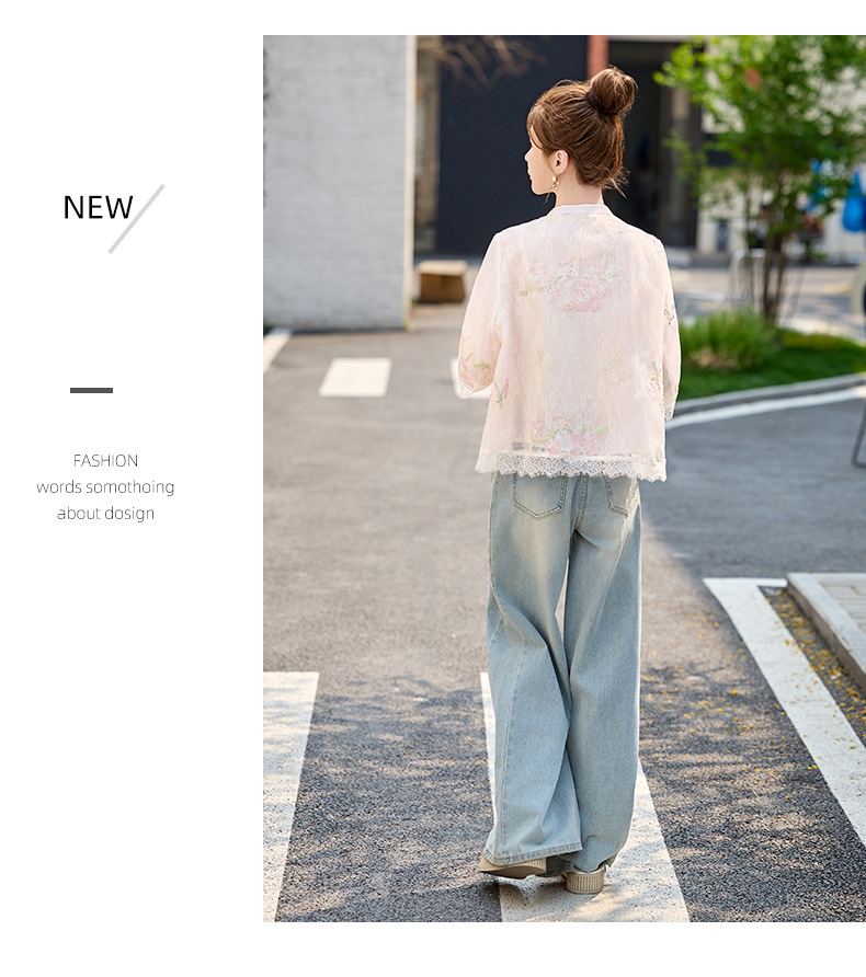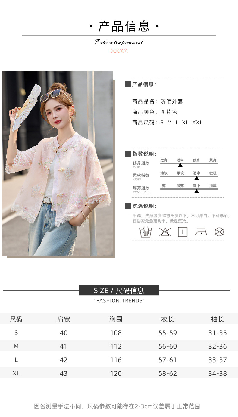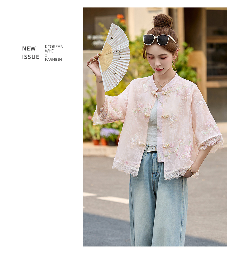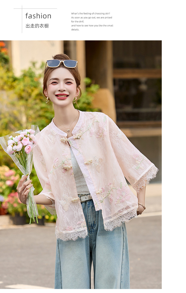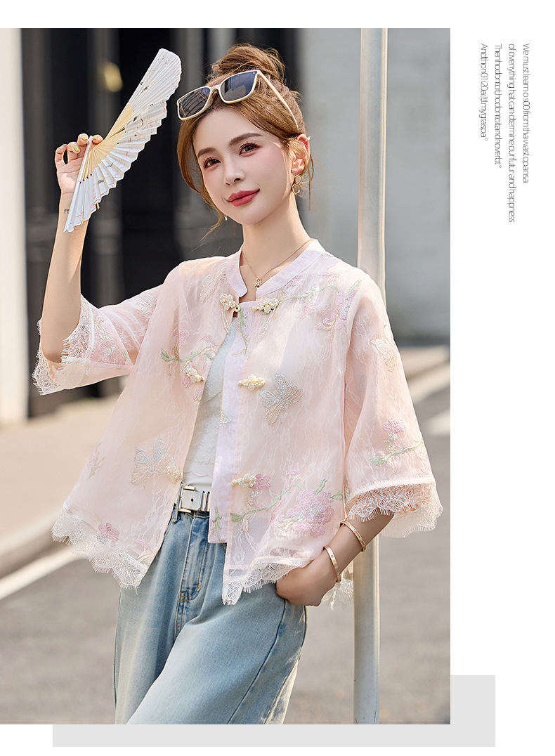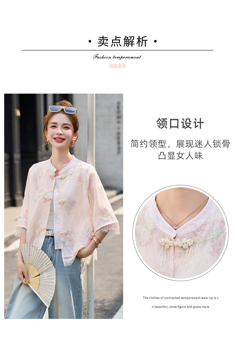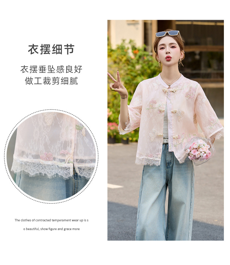 轻奢防晒上衣蕾丝拼接,重工刺绣盘扣立领中袖外套HR-MX8902