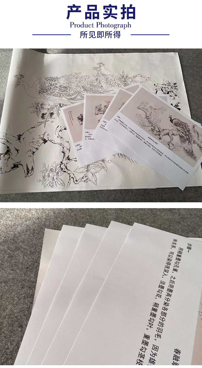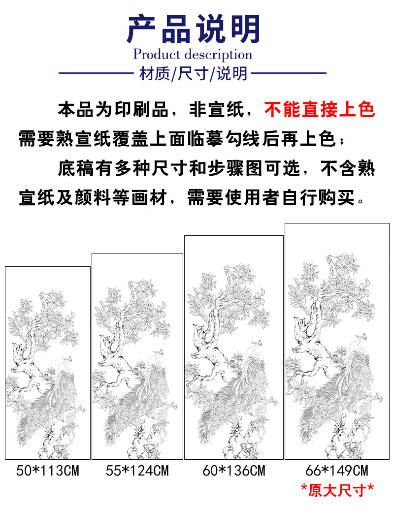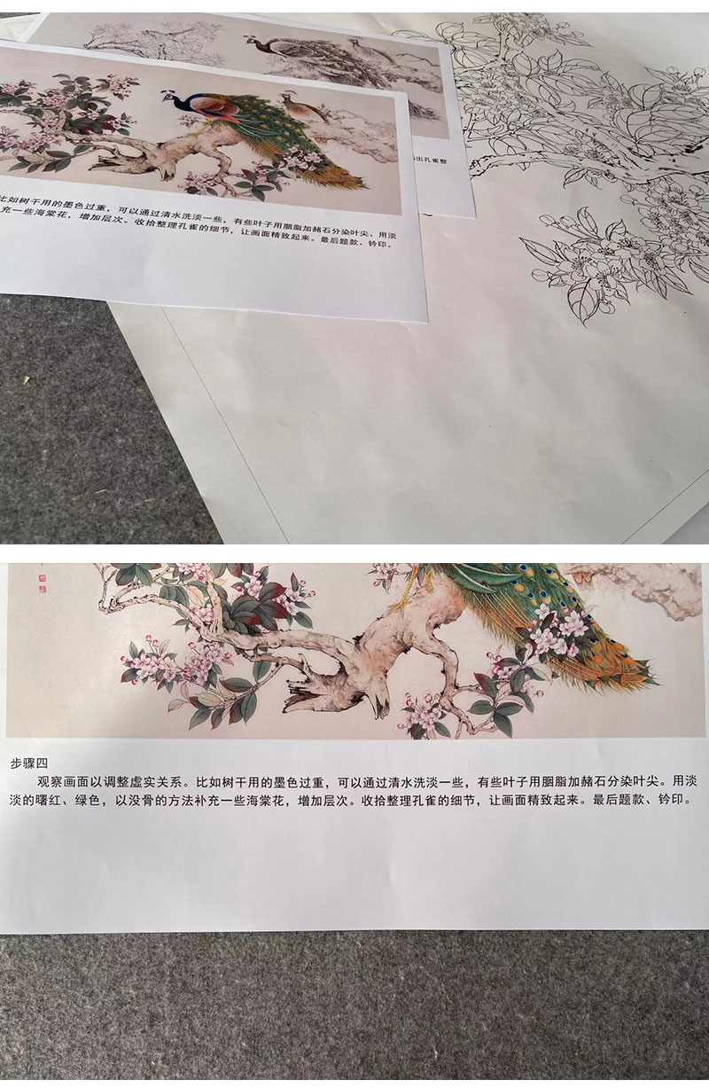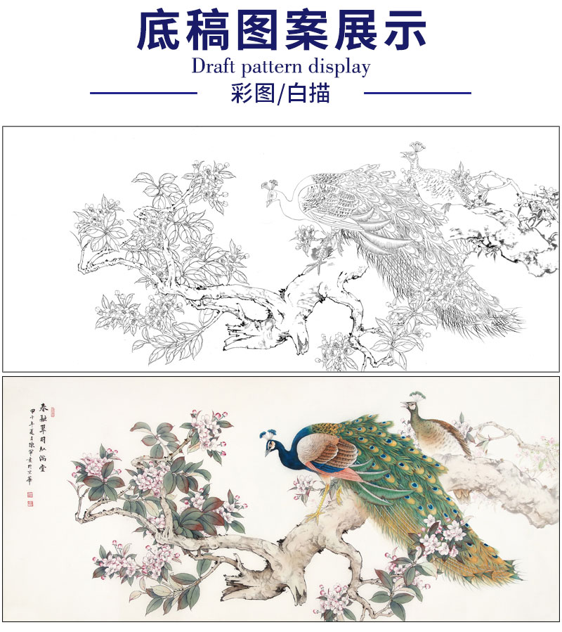 【有步骤】陈军横幅工笔画白描底稿《春融翠羽红满堂》孔雀海棠花初学者临摹花鸟线稿CJ35