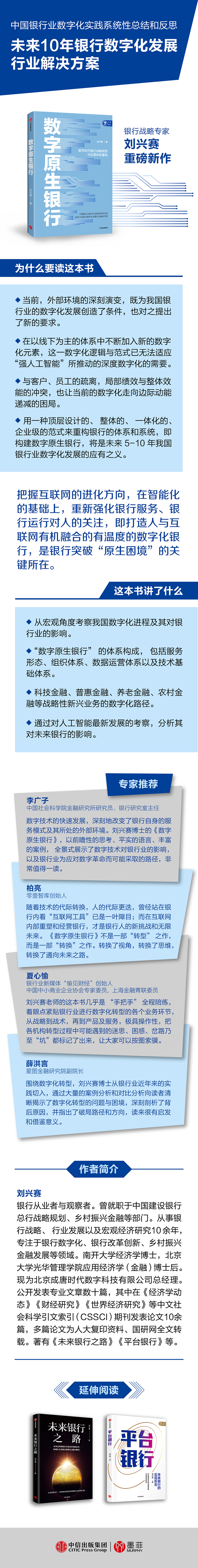 刘兴赛,著,银行从业者与观察者,曾就职于中国建设银行总行战略规划、乡村振兴金融等部门。从事银行战略、行业发展以及宏观经济研究10余年,专注于银行数字化、银行改革创新、乡村振兴金融发展等领域。南开大学经济学博士,北京大学光华管理学院应用经济学(金融)博士后。现为北京成唐时代数字科技有限公司总经理。公开发表专业文章数十篇,其中在《经济学动态》《财经研究》《世界经济研究》等中文社会科学引文索引(CSSCI)期刊发表论文10余篇,多篇论文为人大复印资料、国研网全文转载。著有《未来银行之路》《平台银行》等。