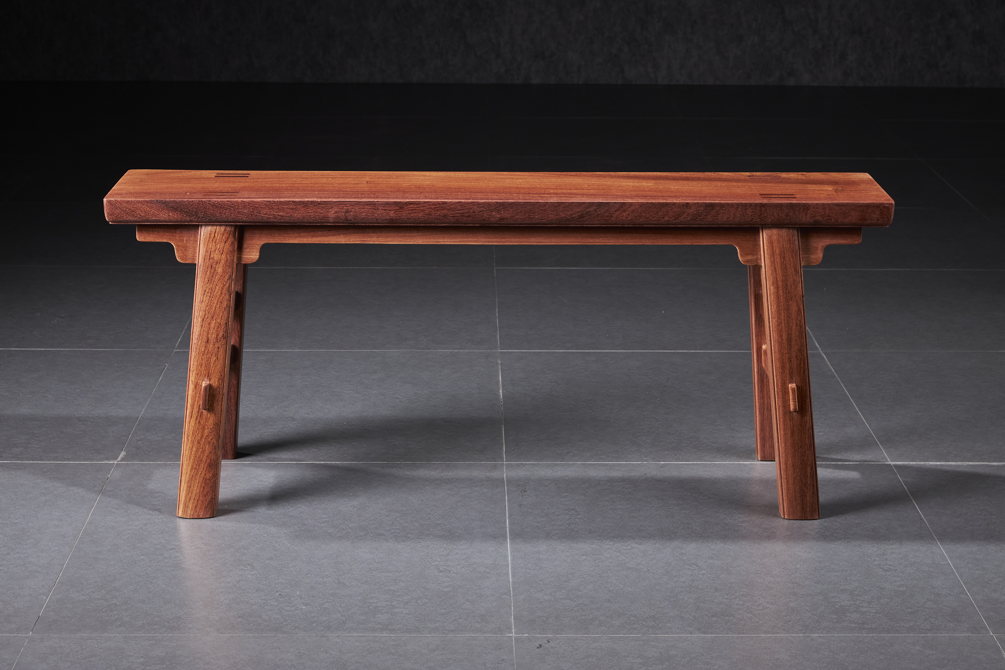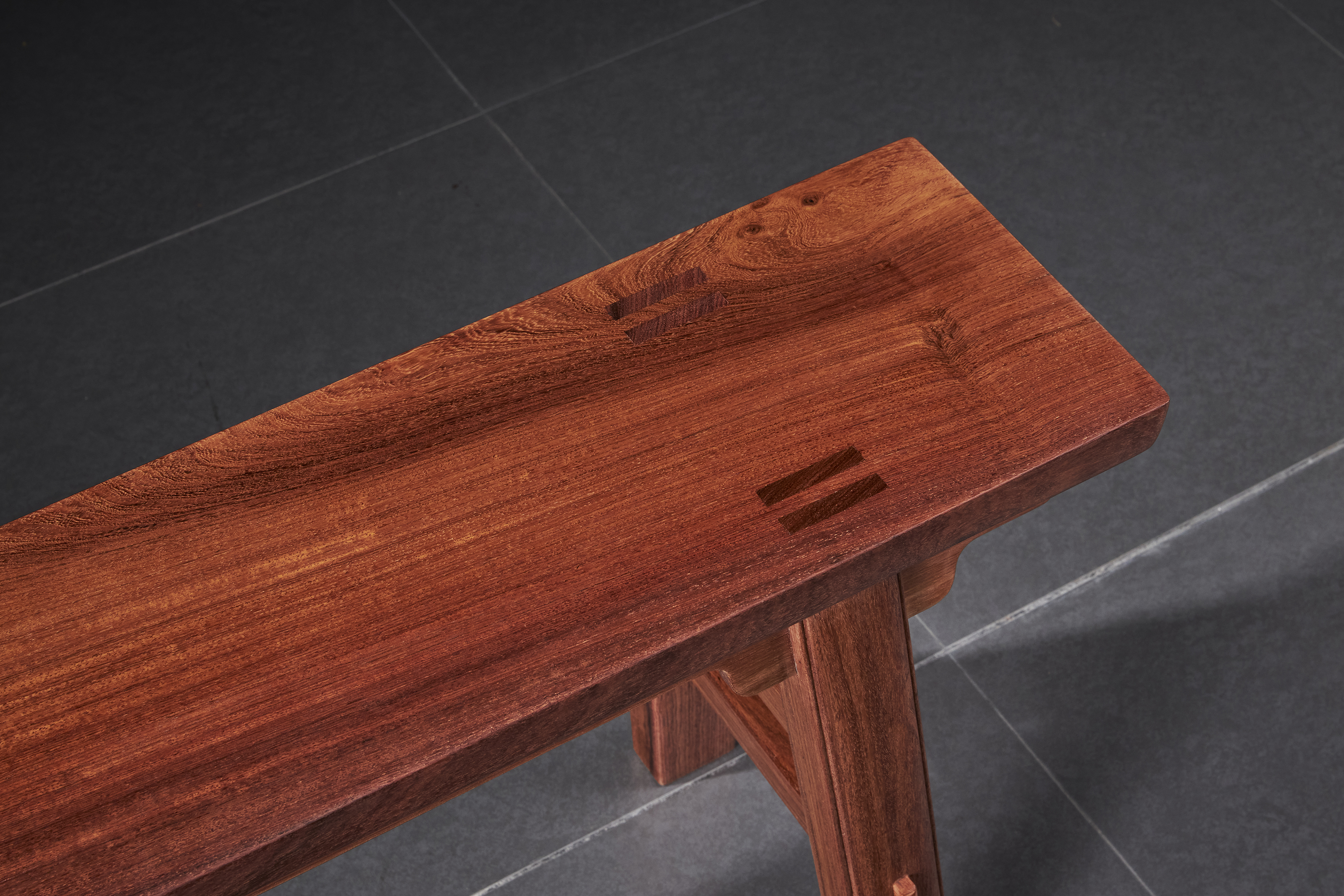 此凳一块玉刀牙做法,长度达到1米1,可容二人定坐,北宋时期即已定型,坐面厚料颇厚,腿足上端开口较深,衔夹宽厚素刀牙牢固稳定,全身仅有细阳线,即下沉的出头作为修饰。