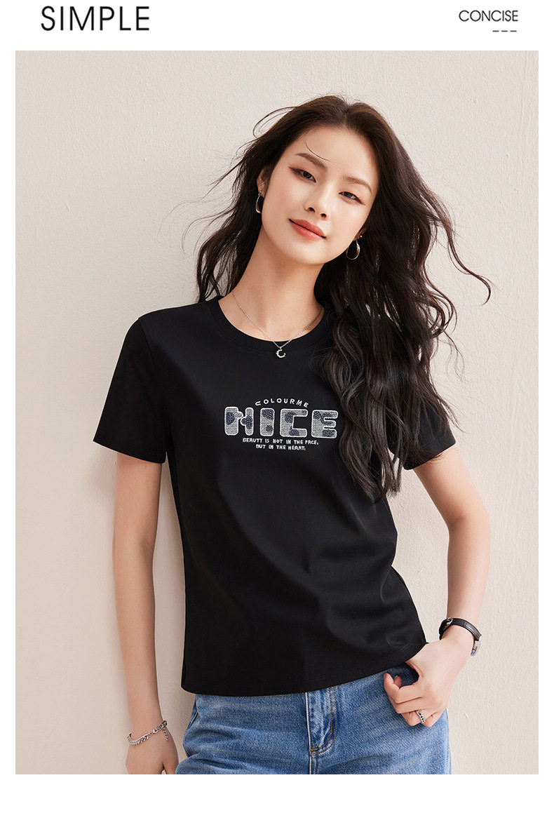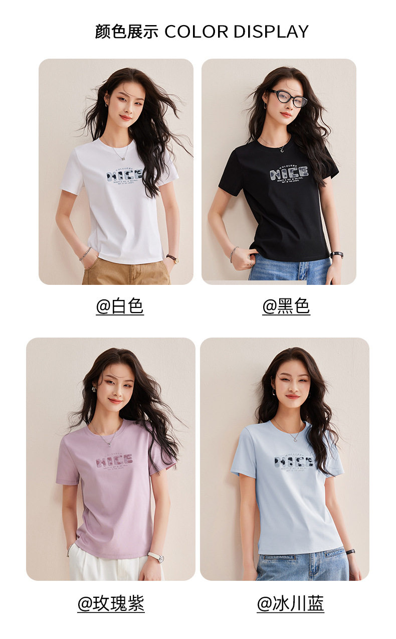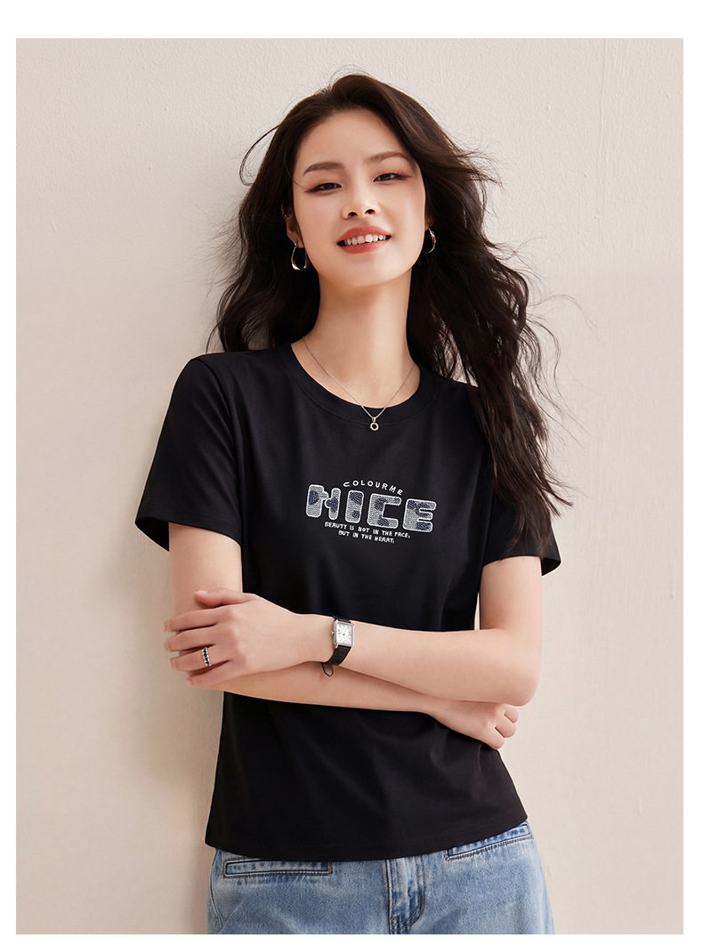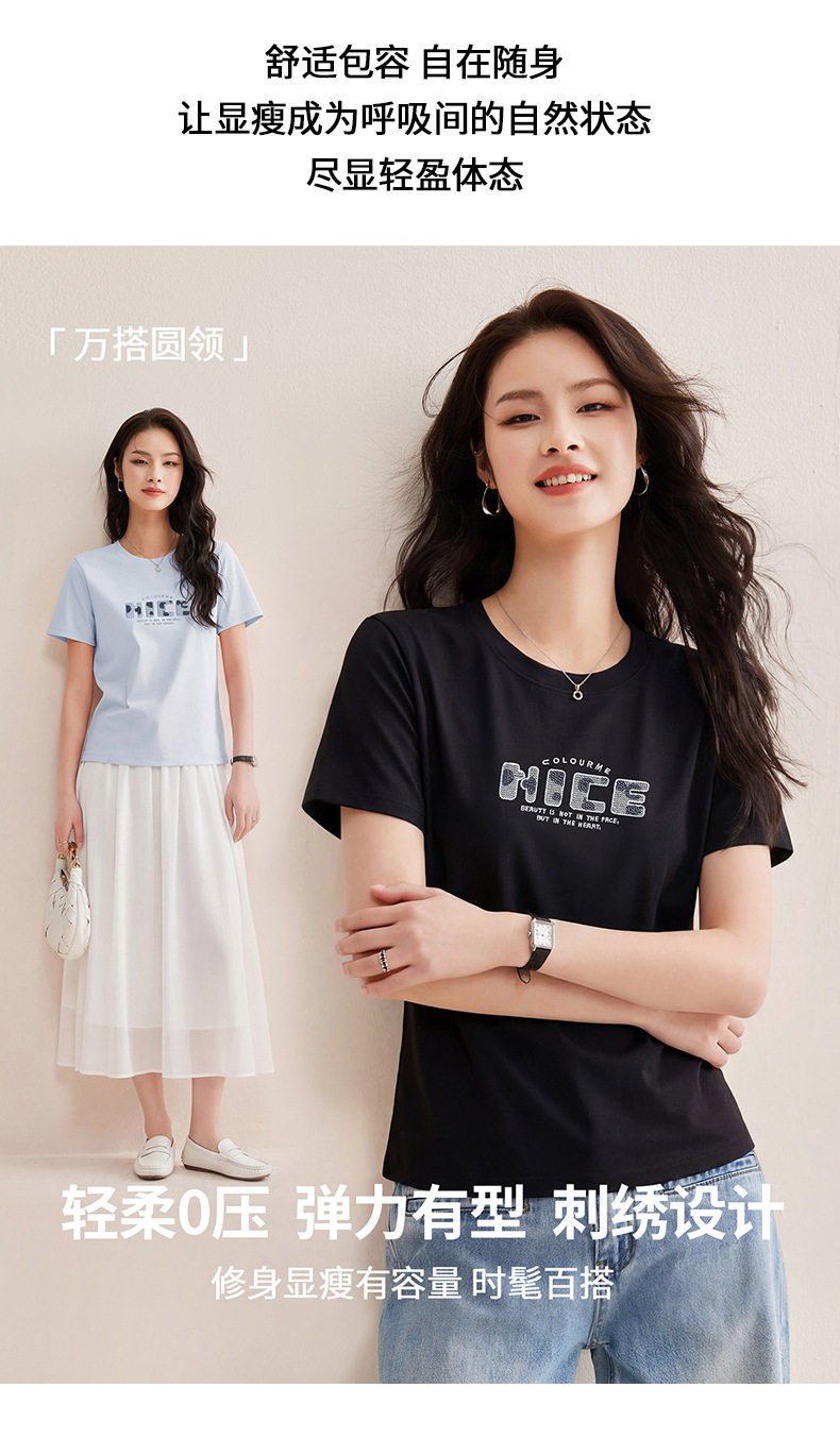 「自j」全新升级【铂金会员128/天猫169/差价41】(13155)洛诗琳气质丝光棉短袖上衣女2026夏季字母刺绣宽松显瘦T恤