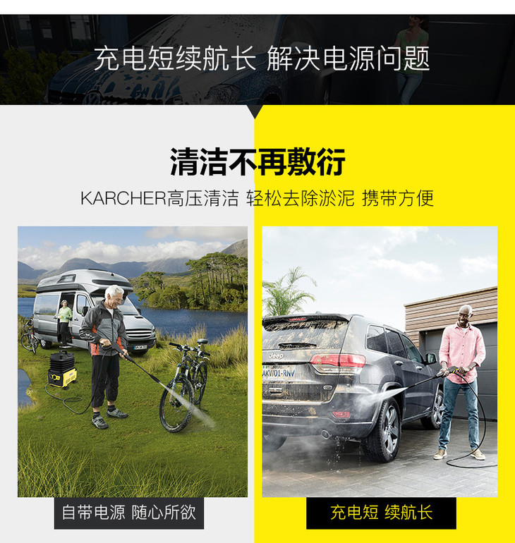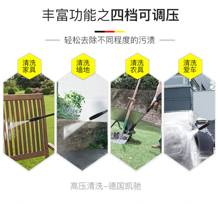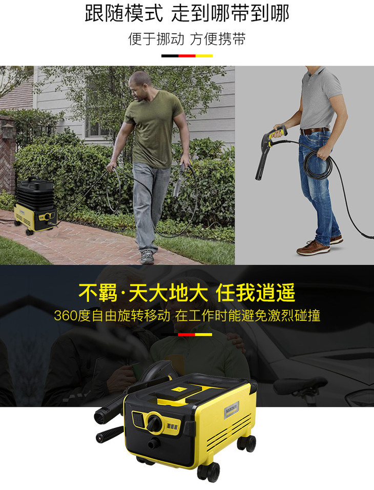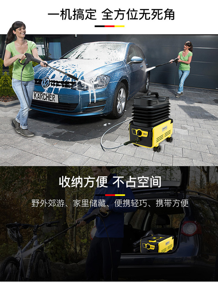 1 关于产品:这款K2高压洗车机区别与传统的洗车机,它便于挪动,方便携带的,并且精密运转低噪音,材料使用的进口泵头,非常地耐用,同时还有着防水防漏电的安全保障。