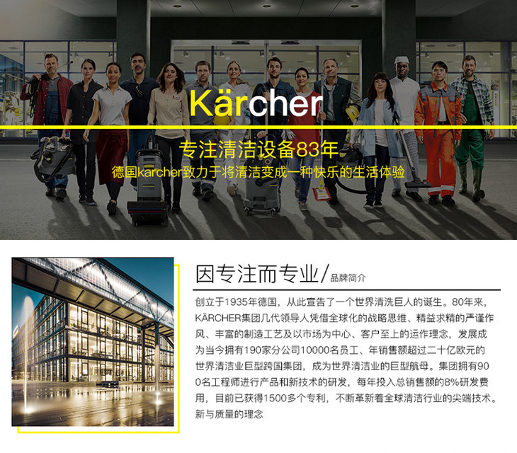 德国凯驰(KARCHER)成立于1935年,有80年的品牌历史,是全球清洁领军品牌,因产品的卓越性能与高超清洗工艺使其曾连续成为1996年和2000年的奥运会清洁设备指定供应商。