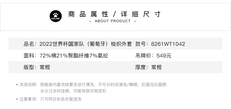 卡尔美2022世界杯国家队主题(比利时)训练梭织外套