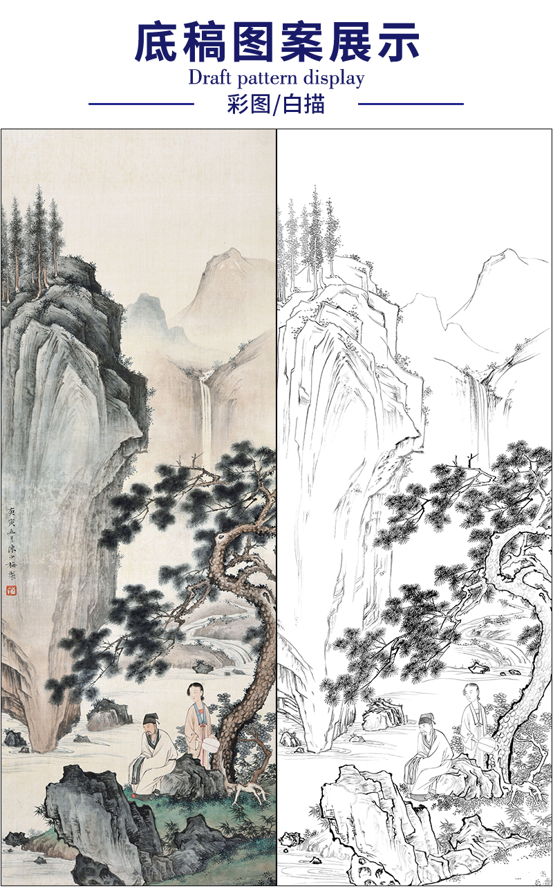 陈少梅山水人物工笔画白描底稿《松影临流》临摹勾线高清打印稿SM21
