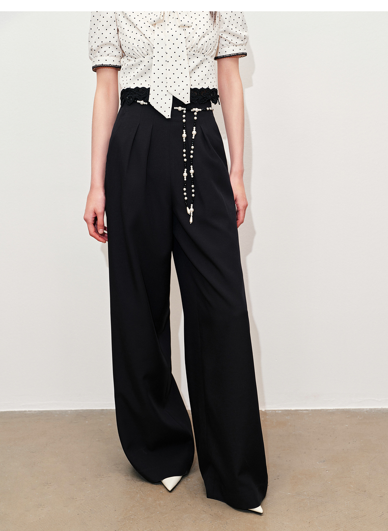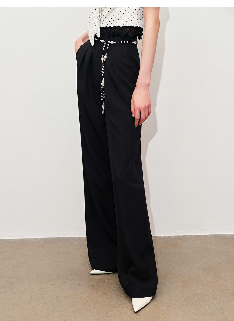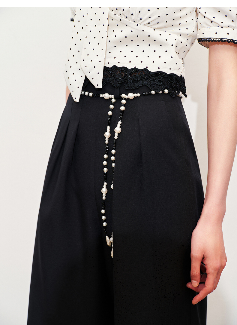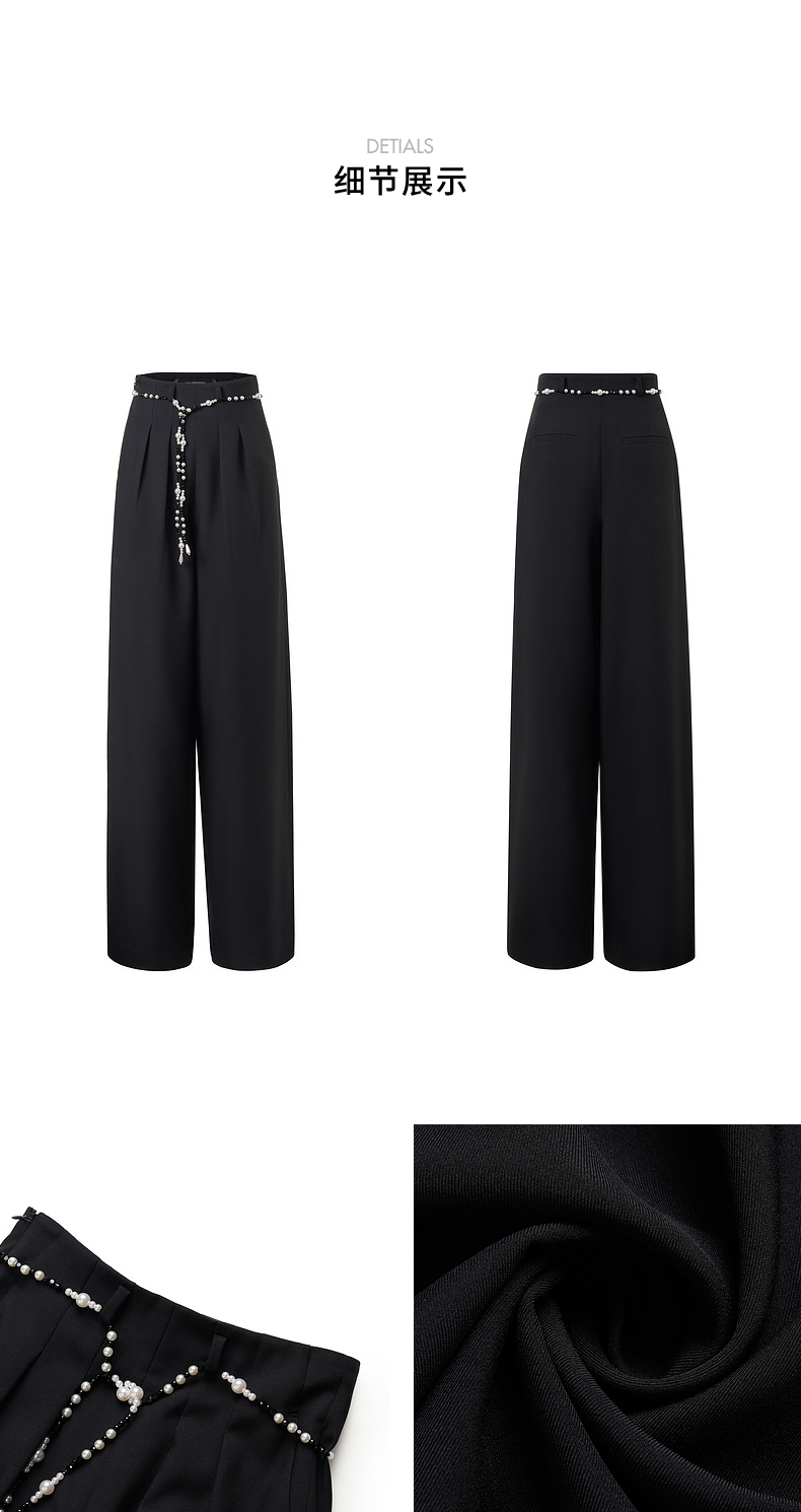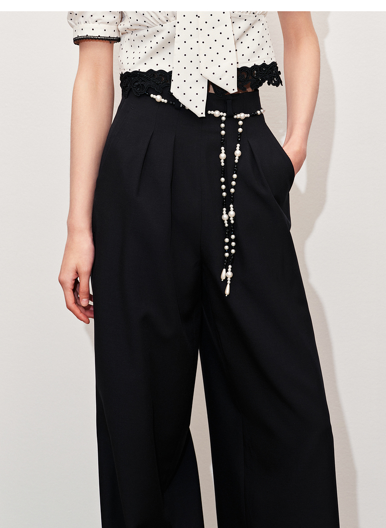 【黑白优雅主义-商场同款】MAXRIENY复古优雅珍珠点缀高腰阔腿裤(货号:MC85PA047)