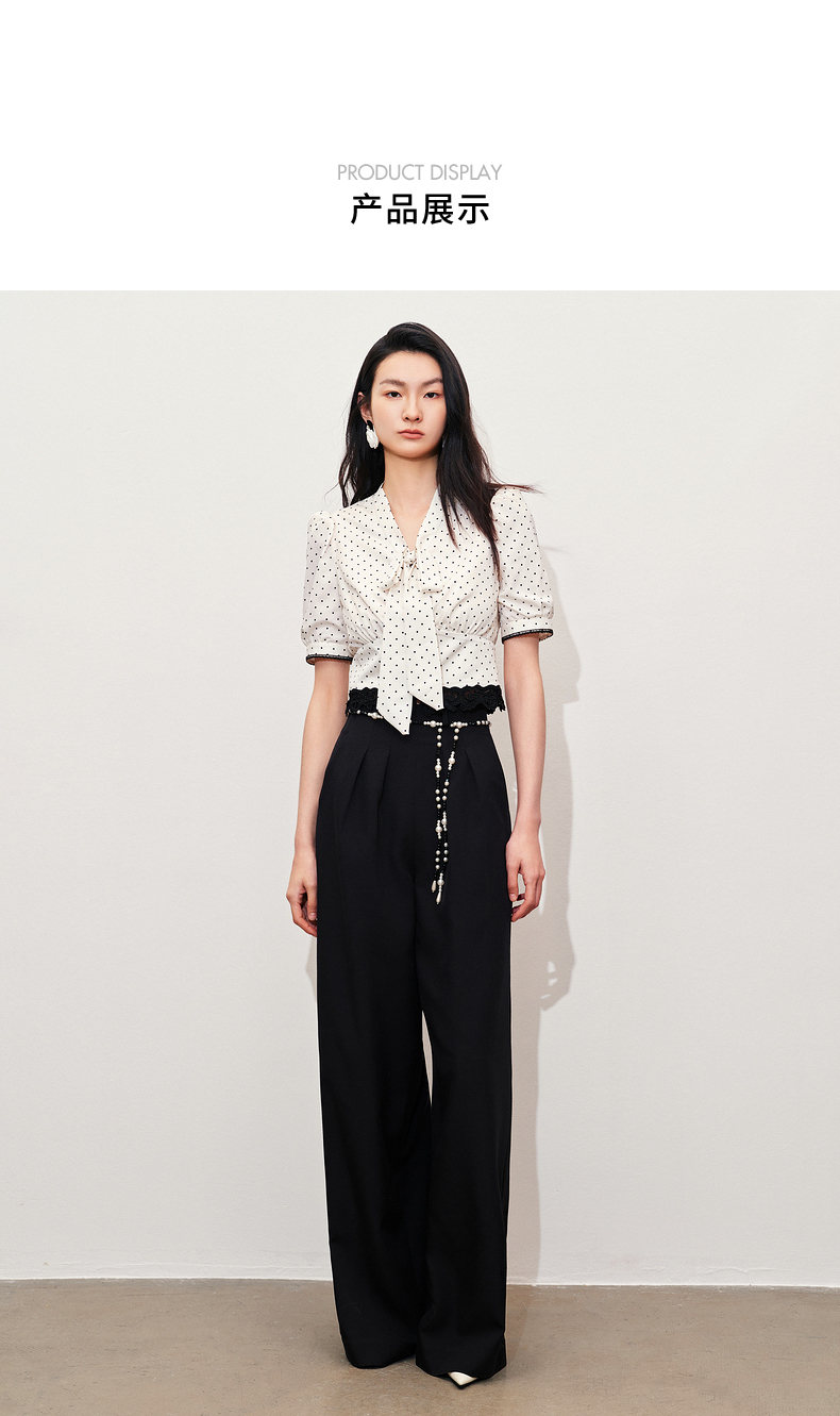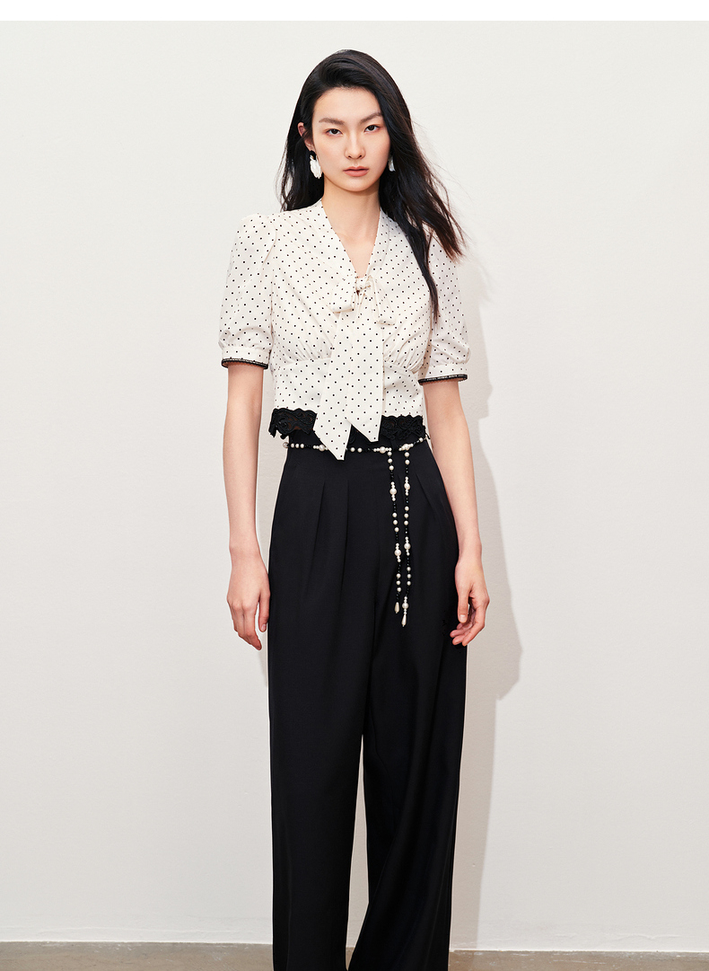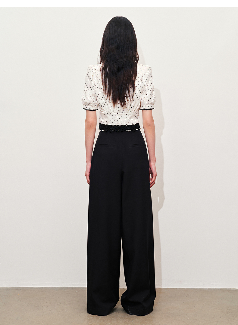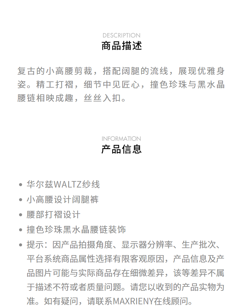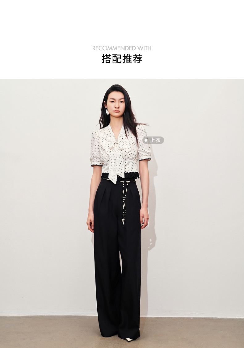 【黑白优雅主义-商场同款】MAXRIENY复古优雅珍珠点缀高腰阔腿裤(货号:MC85PA047)