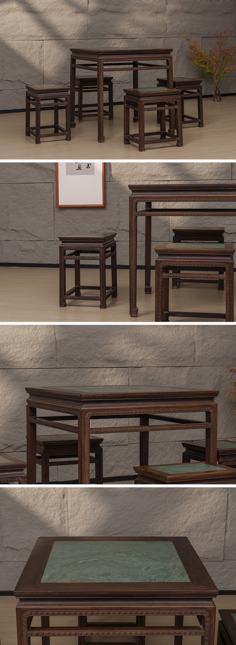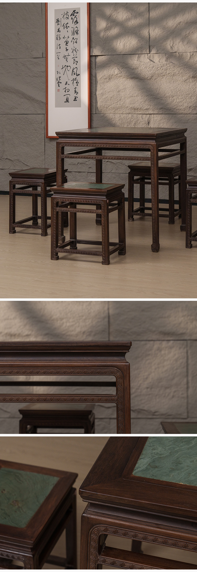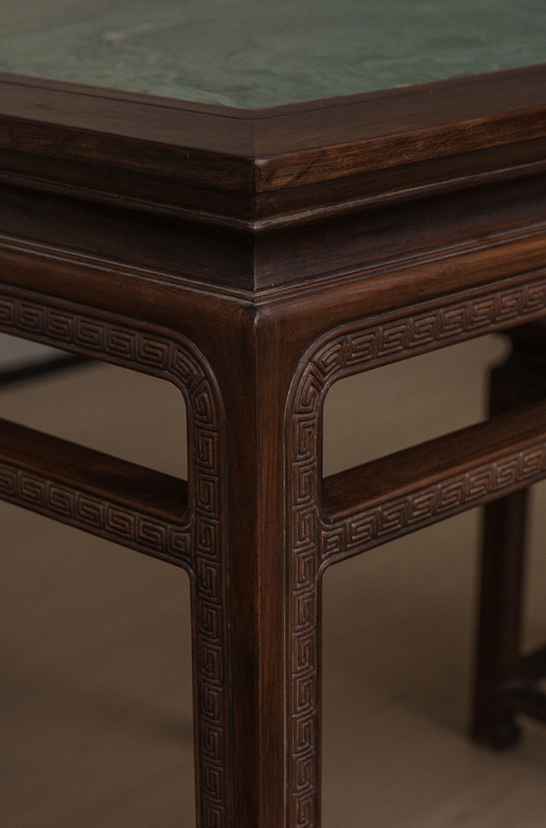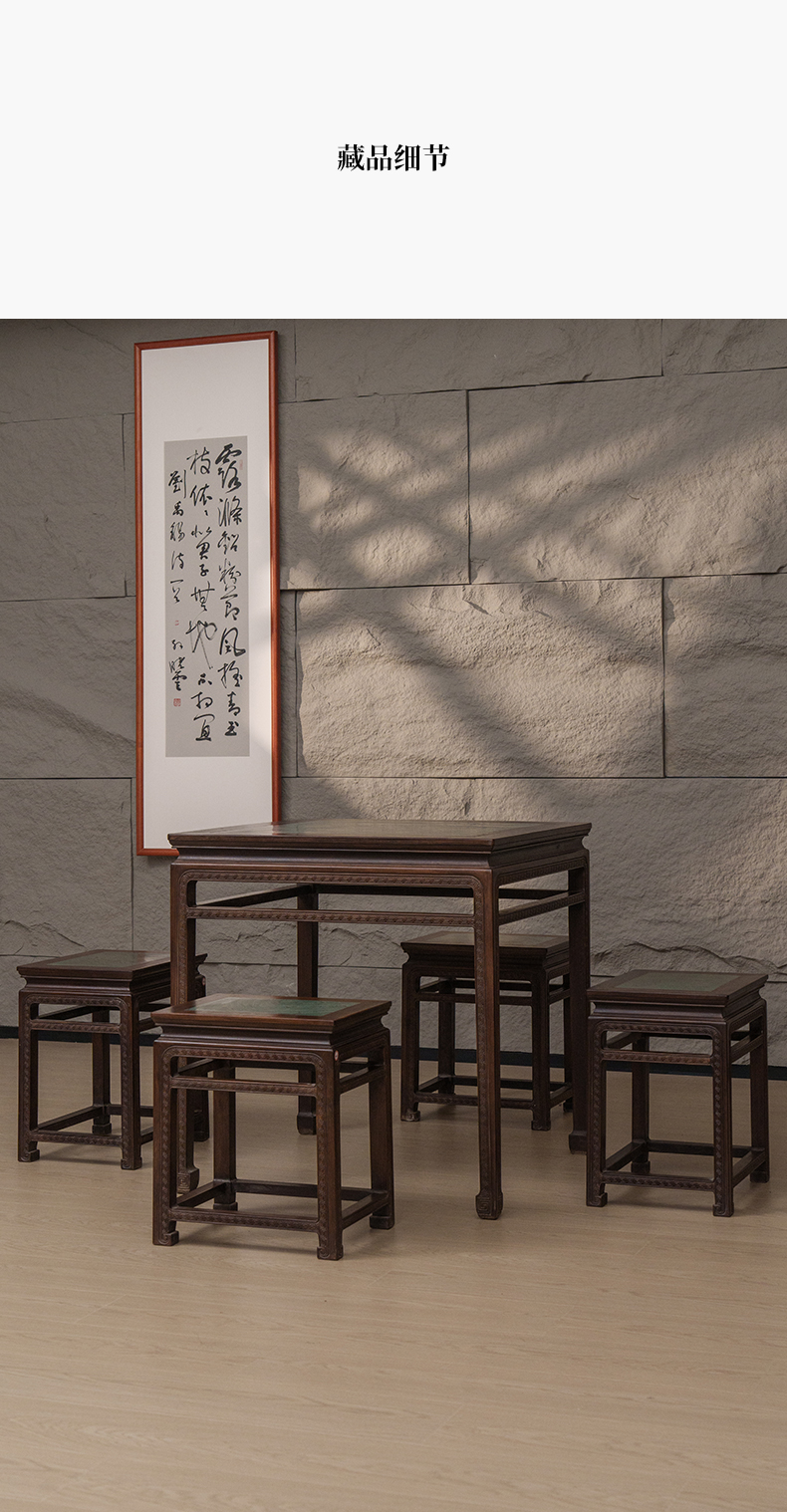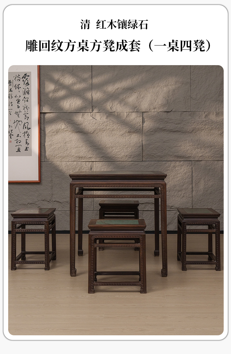 清 红木镶绿石雕回纹方桌方凳成套(一桌四凳)