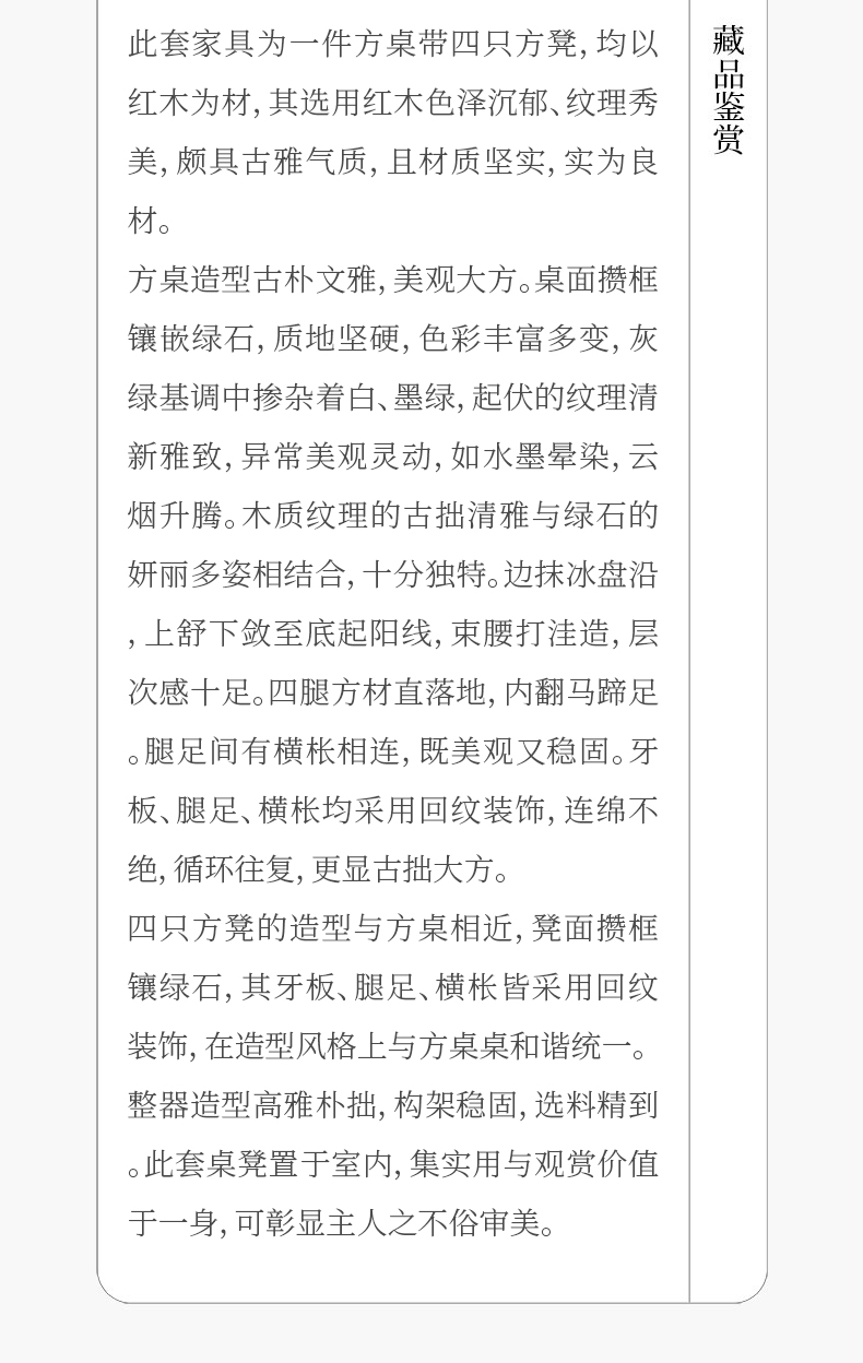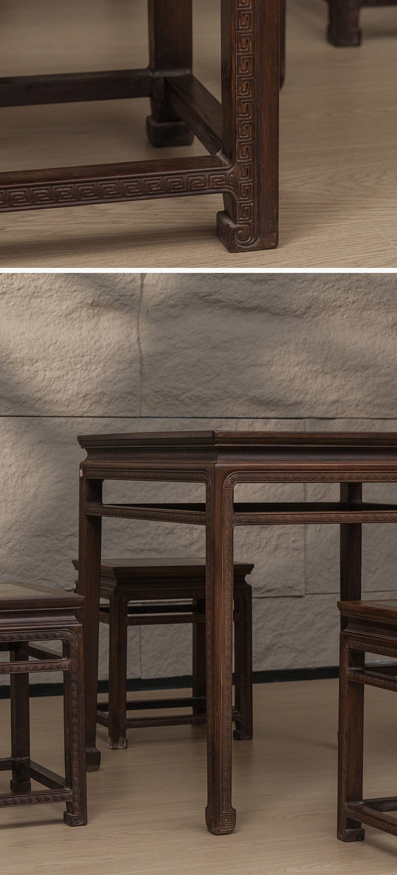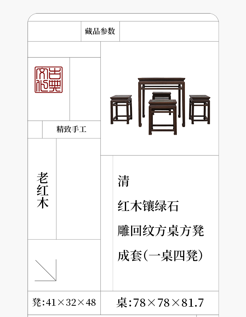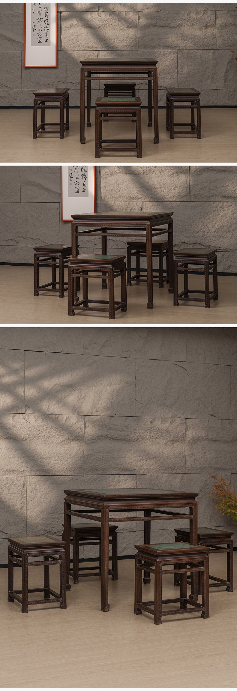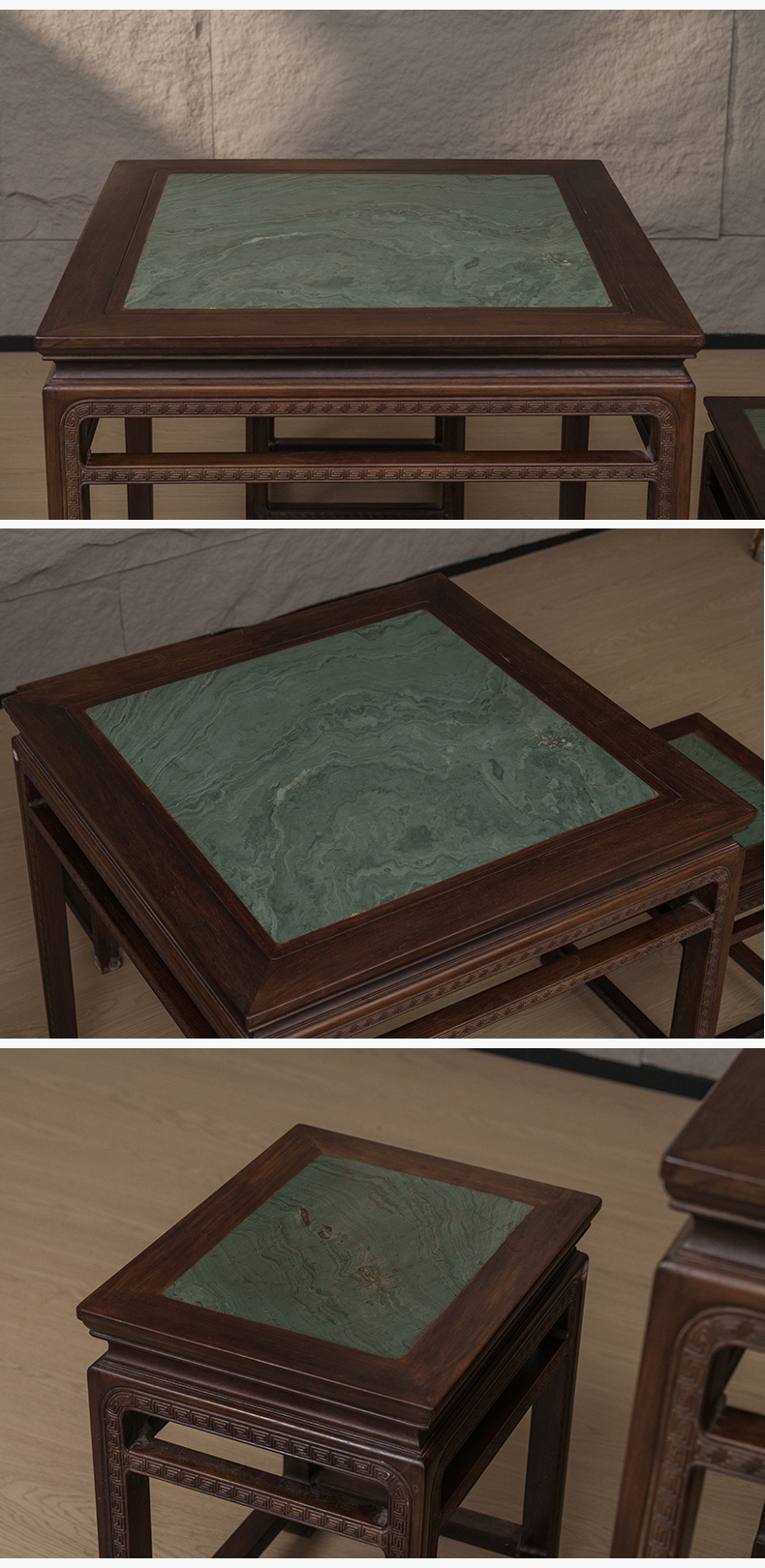 清 红木镶绿石雕回纹方桌方凳成套(一桌四凳)