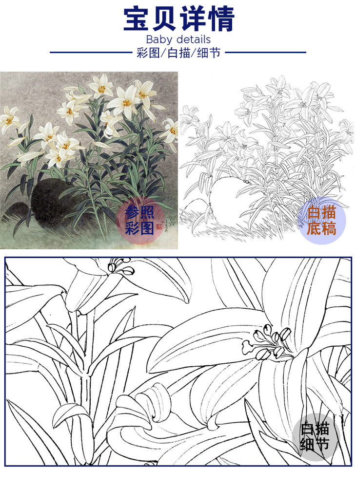 工笔花鸟白描底稿-王庆升百合花-斗方小品册页-QB01