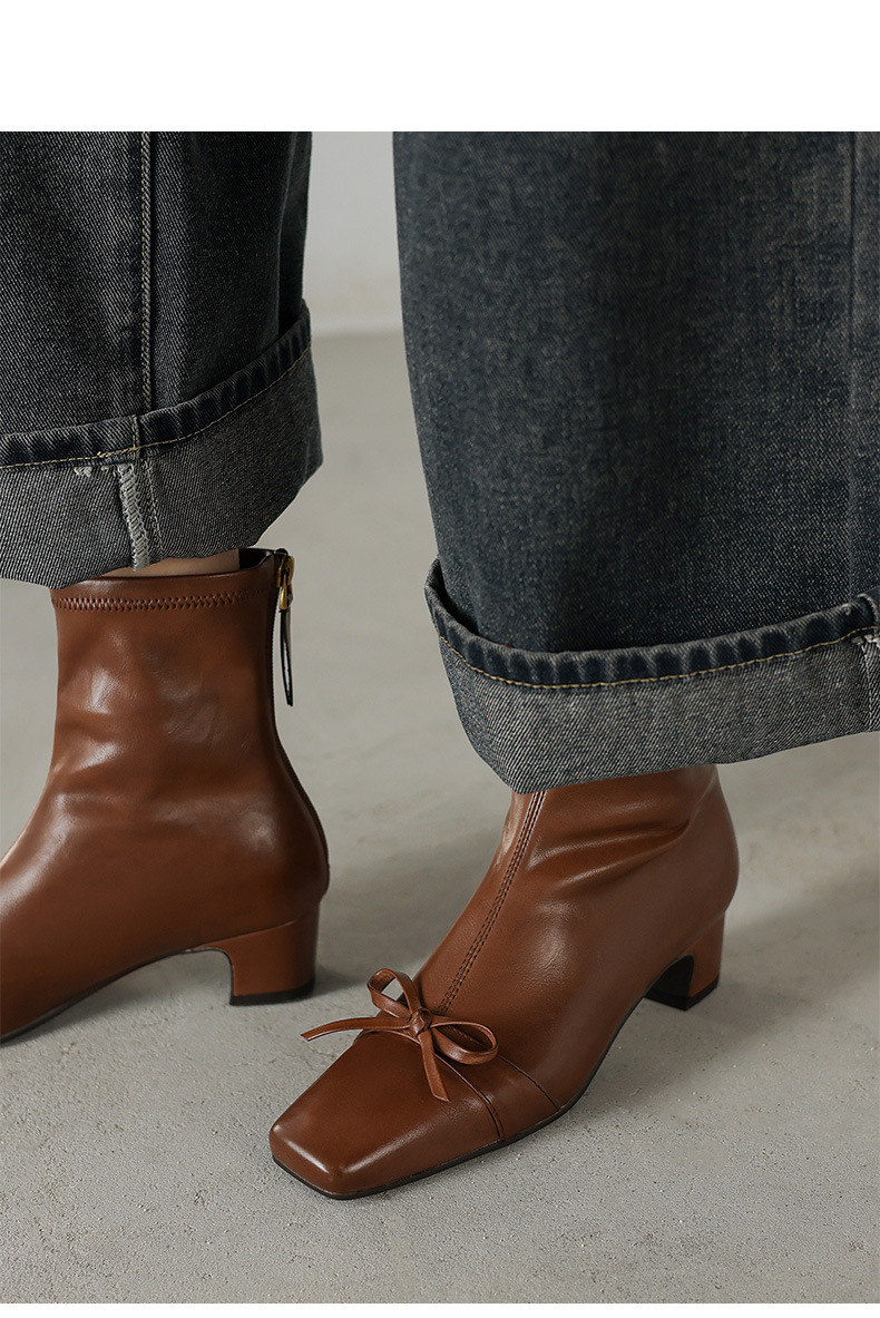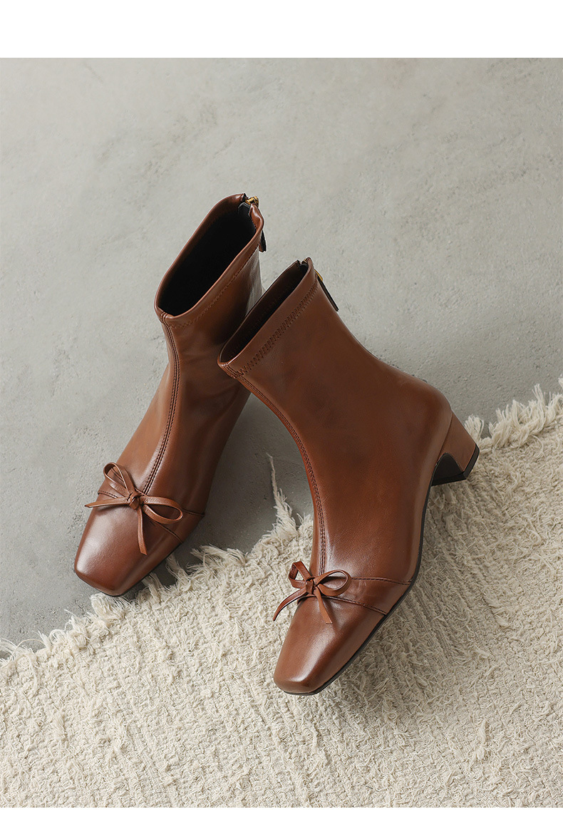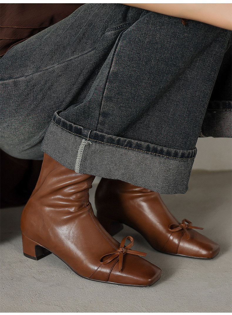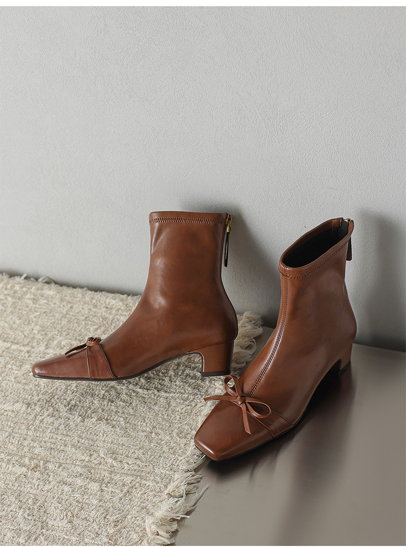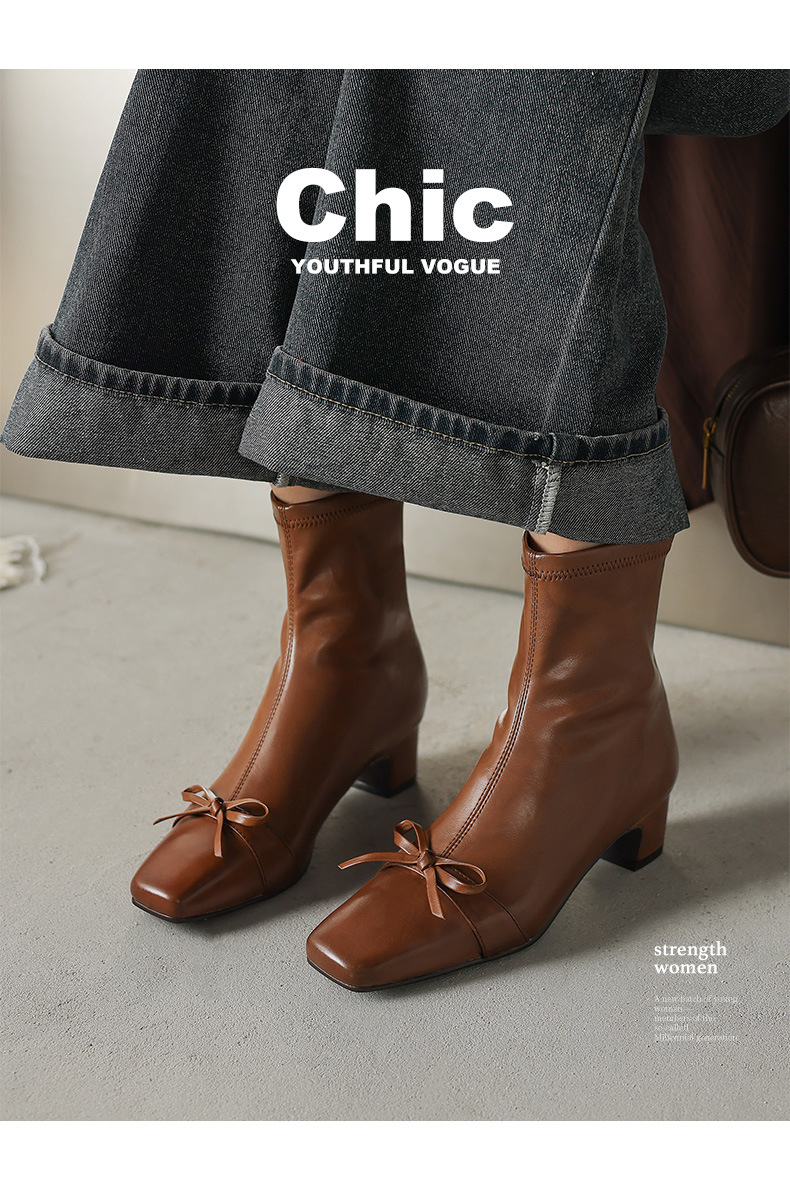 学院风蝴蝶结4cm中跟粗跟后拉链短筒马丁靴方头弹力瘦瘦靴女2025
