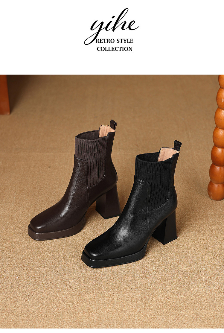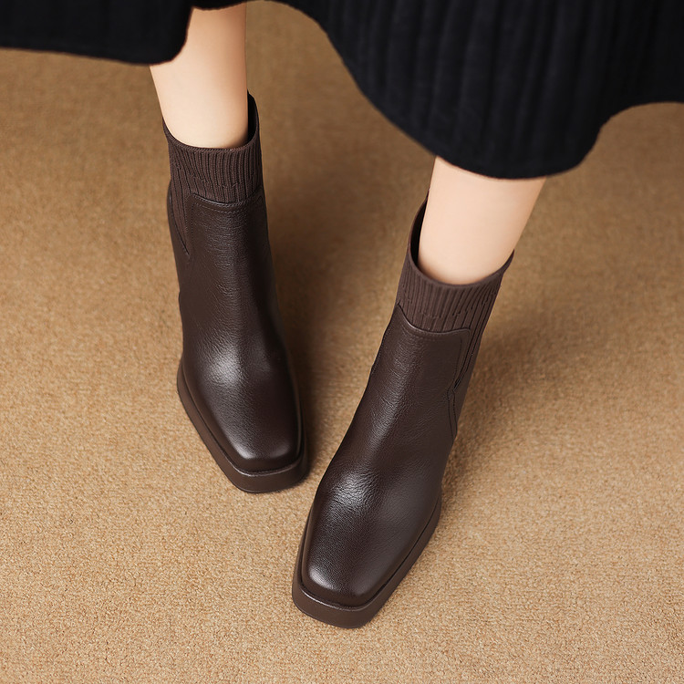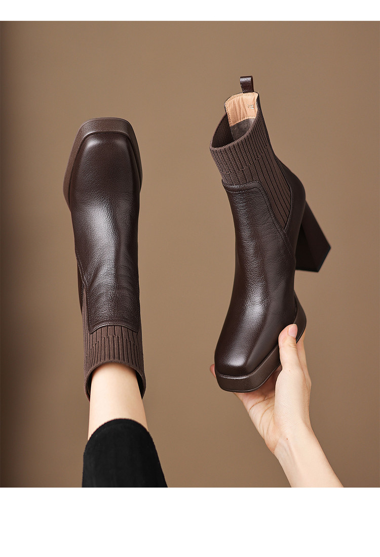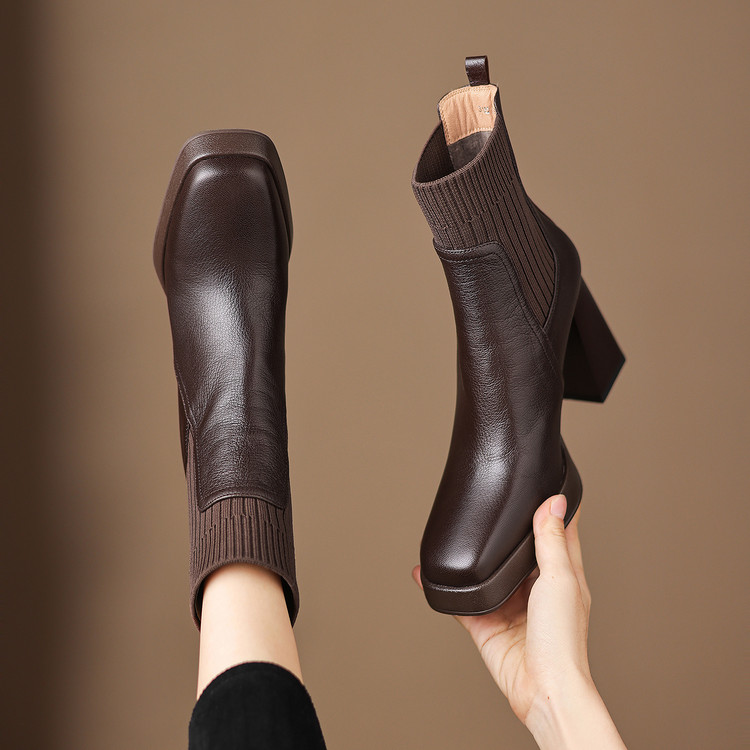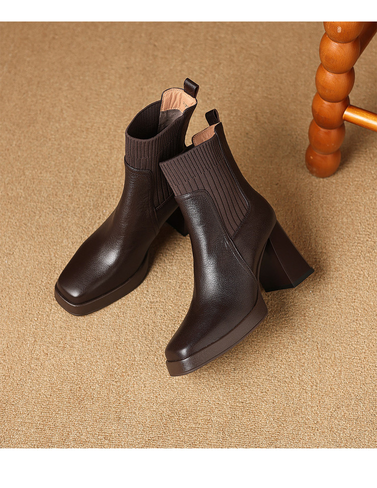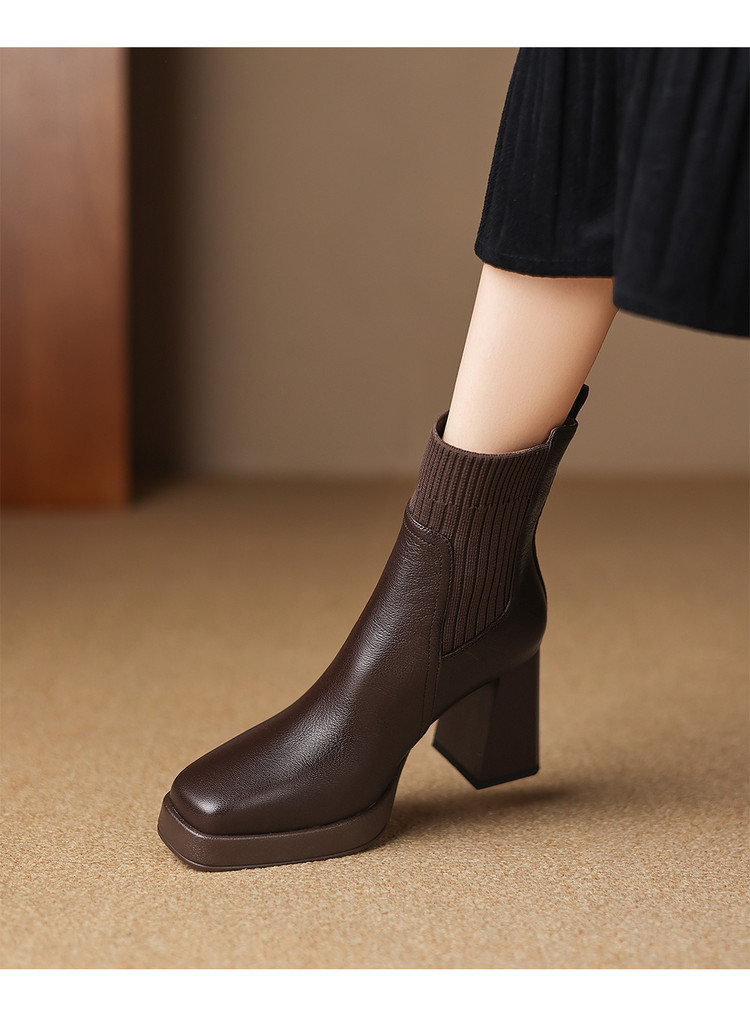 【预售5天】复古真皮防水台高跟弹力靴女秋冬新款粗跟厚底方头针织毛线筒短靴ASN&3122