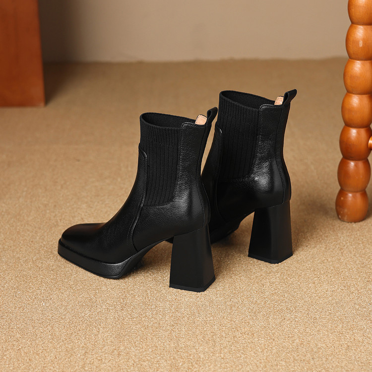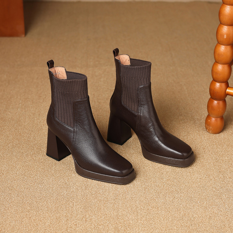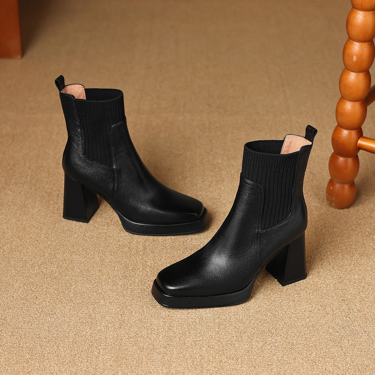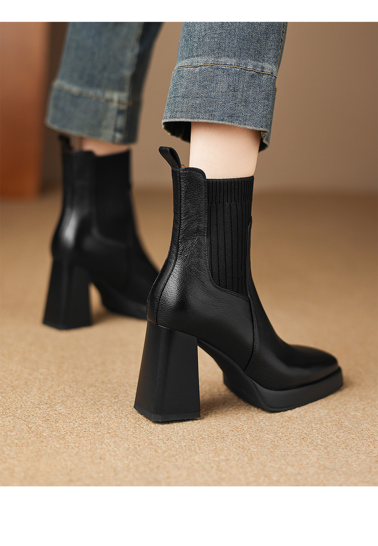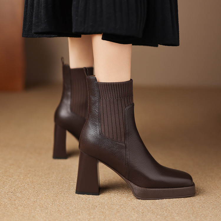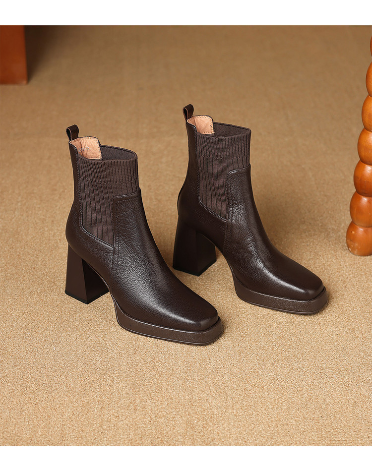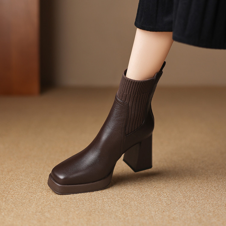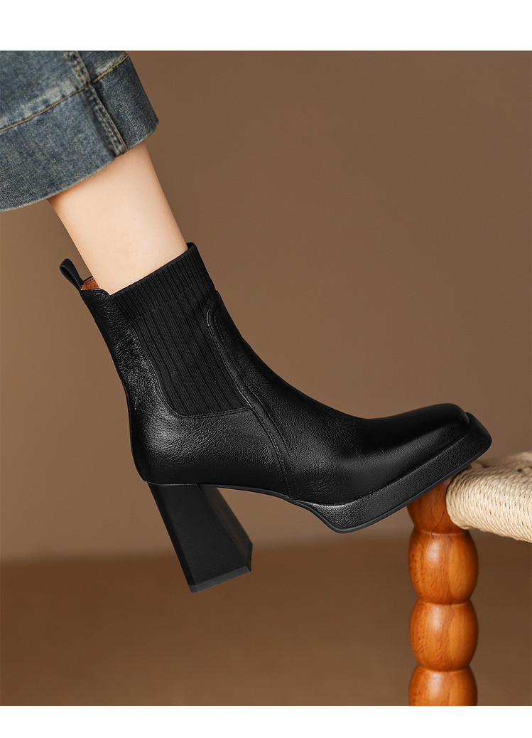 【预售5天】复古真皮防水台高跟弹力靴女秋冬新款粗跟厚底方头针织毛线筒短靴ASN&3122