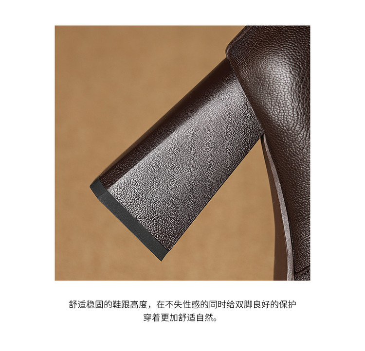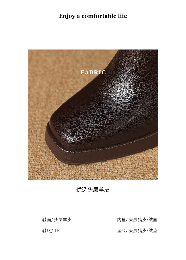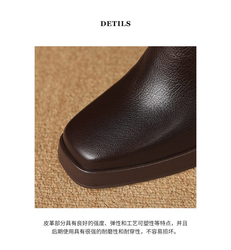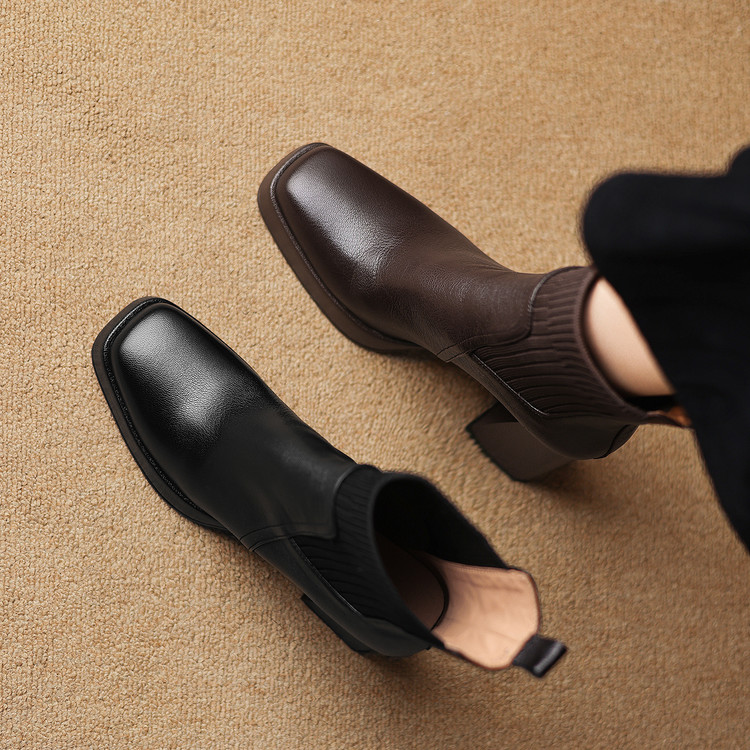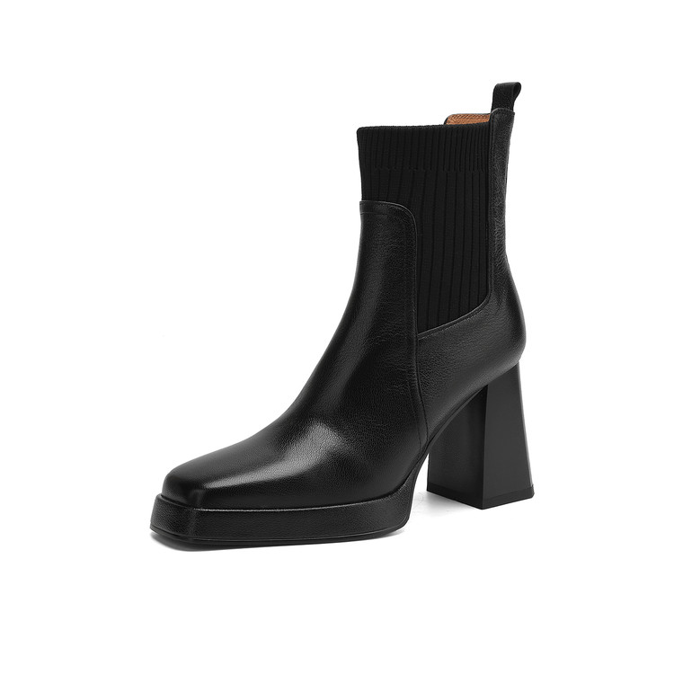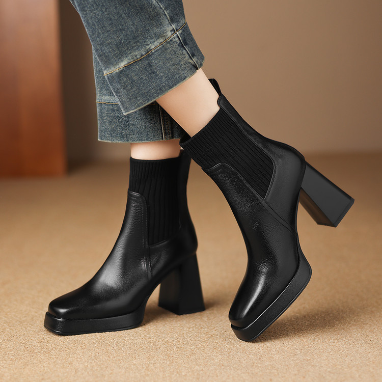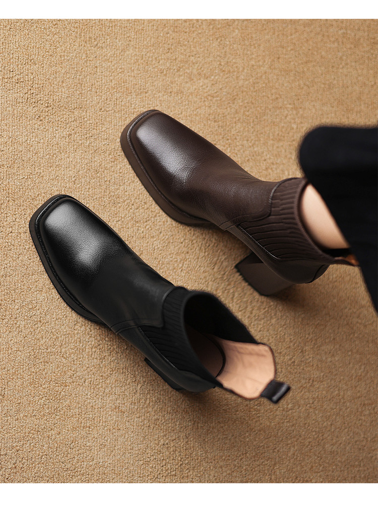 【预售5天】复古真皮防水台高跟弹力靴女秋冬新款粗跟厚底方头针织毛线筒短靴ASN&3122