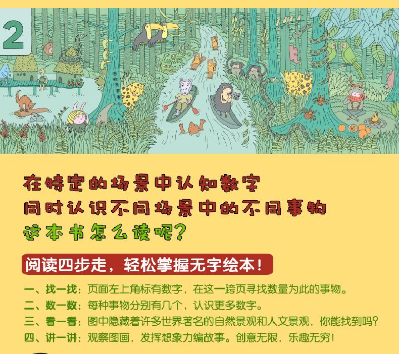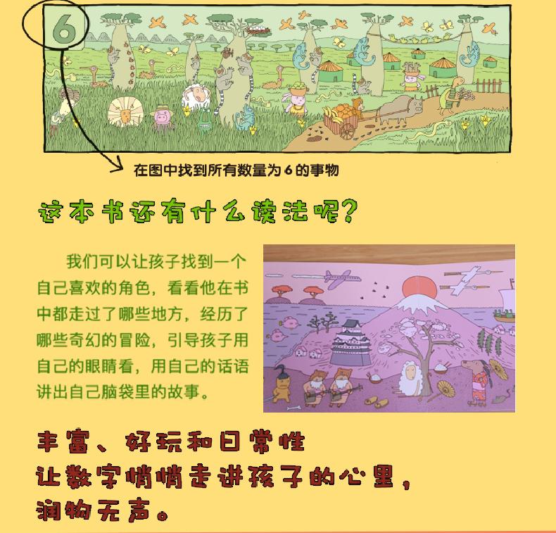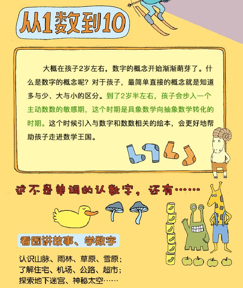 《从1数到10》是一本看图学习数字的趣味故事书。每一跨页的左上角都标有一个数字,代表了小朋友要在图中寻找与数字一样多的同类事物。