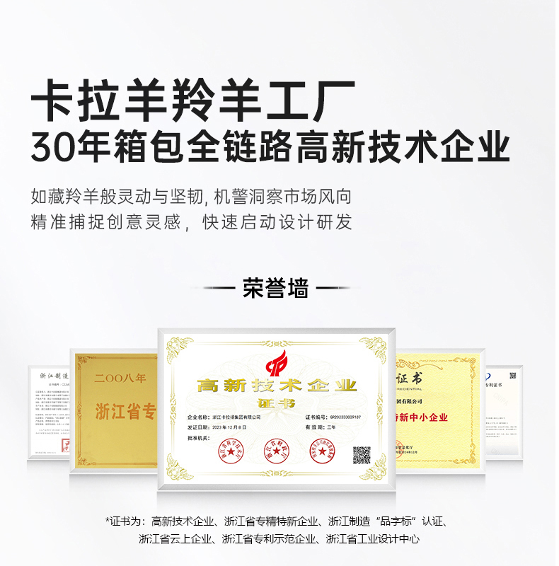 浙江卡拉扬集团有限公司专注箱包27年,旗下有卡拉羊和9UM两大品牌,有浙江海宁和江苏沭阳两大工厂,拥有多项知识产权,是集智能化、设计生产、品牌营销为一体的综合型企业。