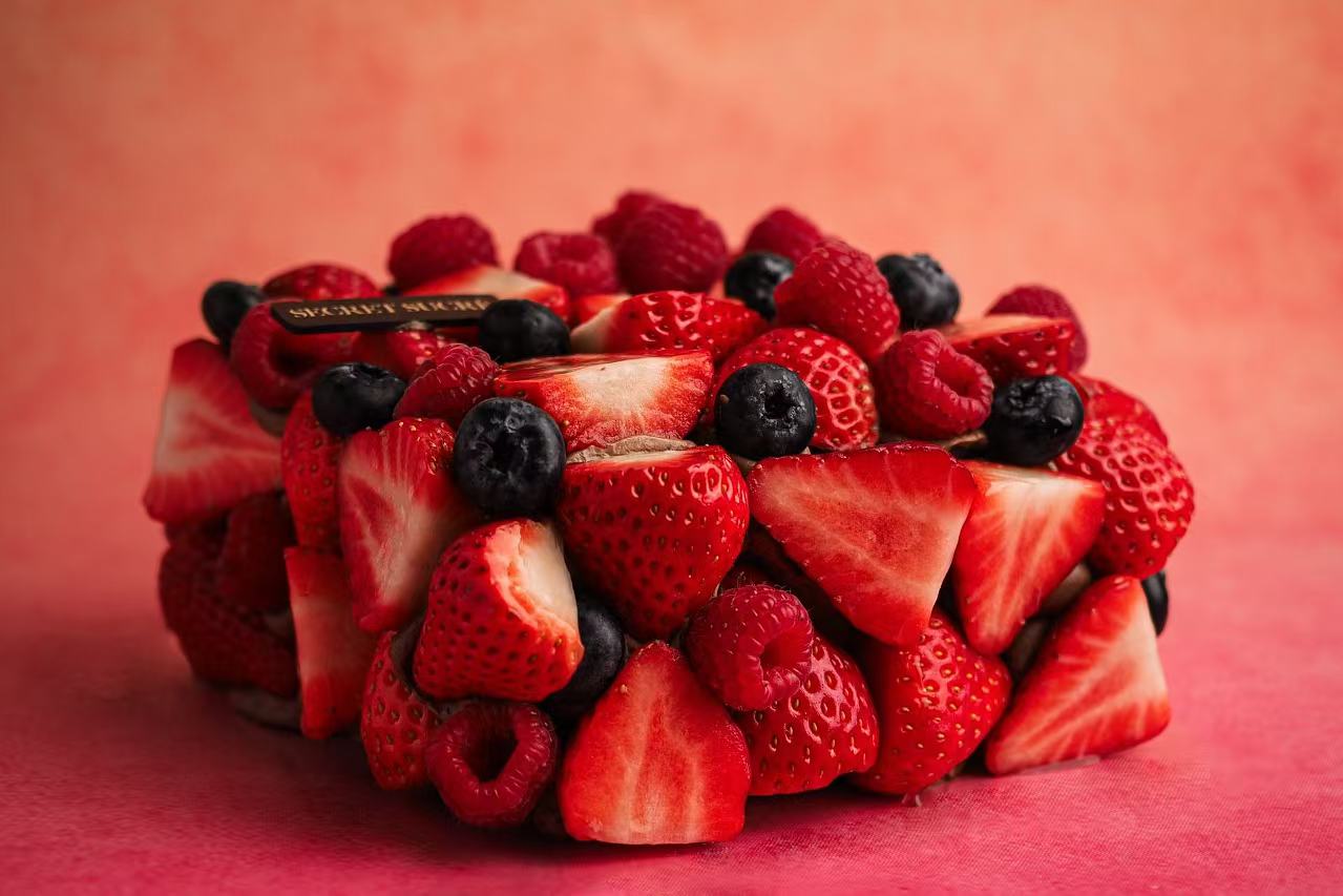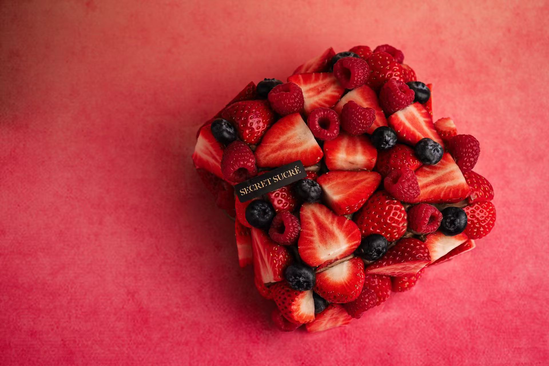 拿破仑酥皮外完整包裹一层巧克力黄油奶油,整体用红颜草莓铺满,然后用树莓、蓝莓做最后的点缀装饰。每个蛋糕使用草莓的重量接近1000克,份量十足!