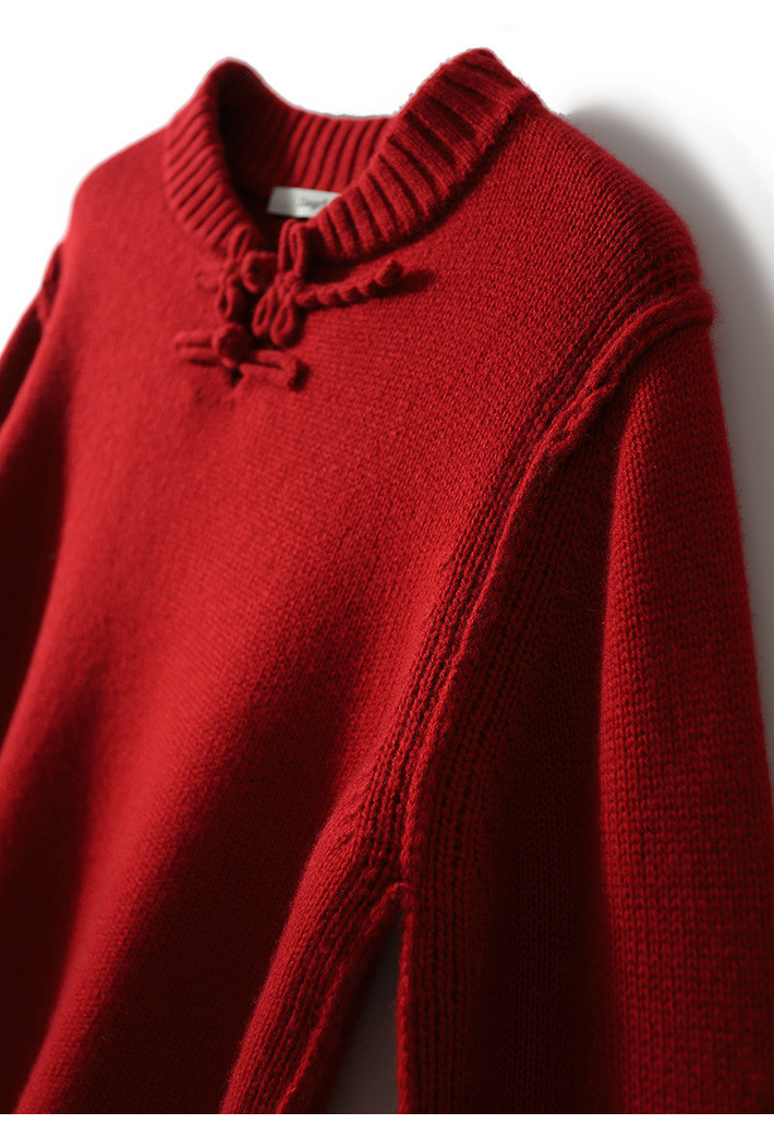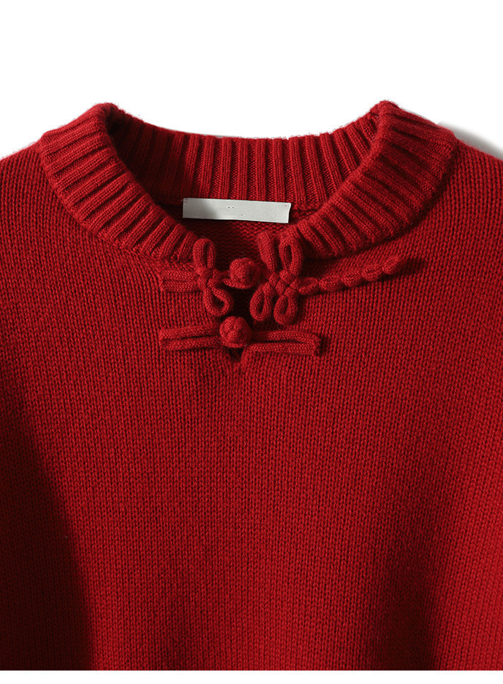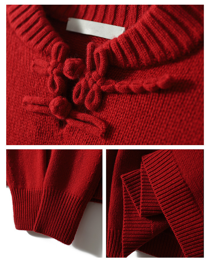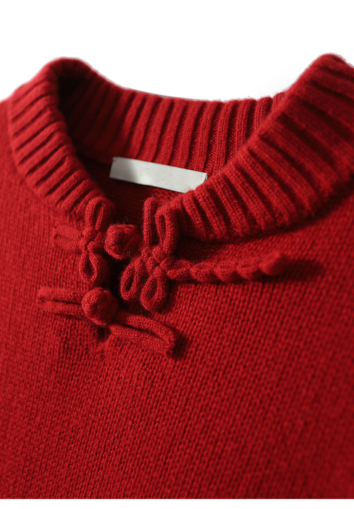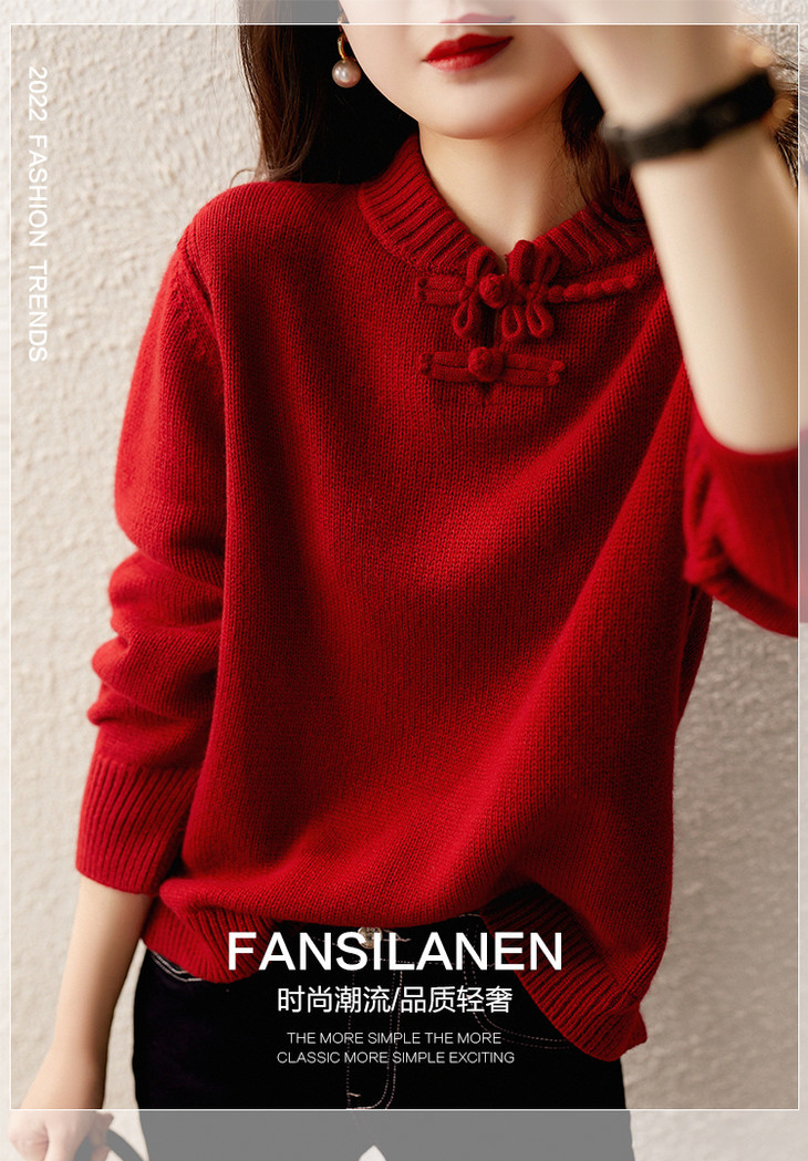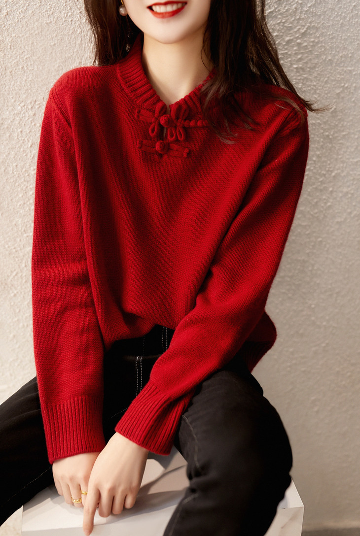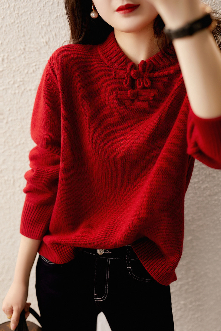 YYM7721 轻复古国风范别致蜻蜓盘扣立领针织毛衣女洋气红色上衣厚