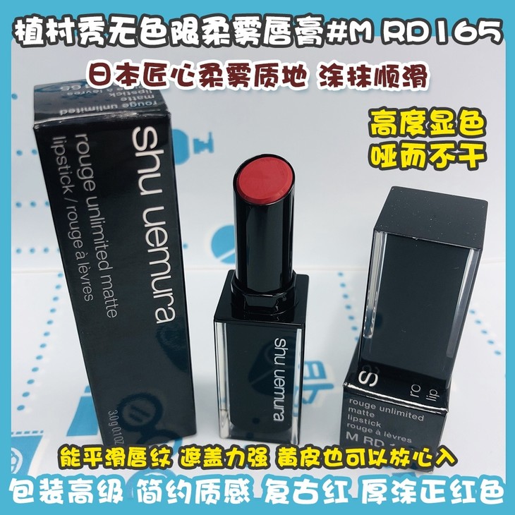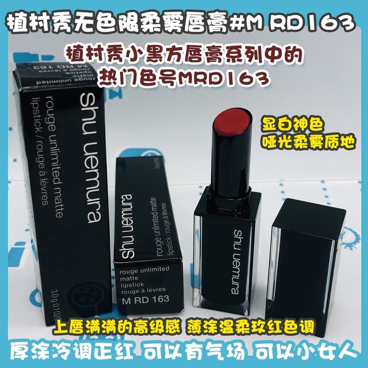 #M RD163 👍植村秀小黑方唇膏系列中的热门色号MRD163,🌟显白神色。哑光柔雾质地,上唇满满的高级感,薄涂温柔玫红色调🌺,厚涂冷调正红,可以有气场,可以小女人,百搭不挑。☘滋润度也够足,轻轻松松涂出饱满润泽的feel~☄