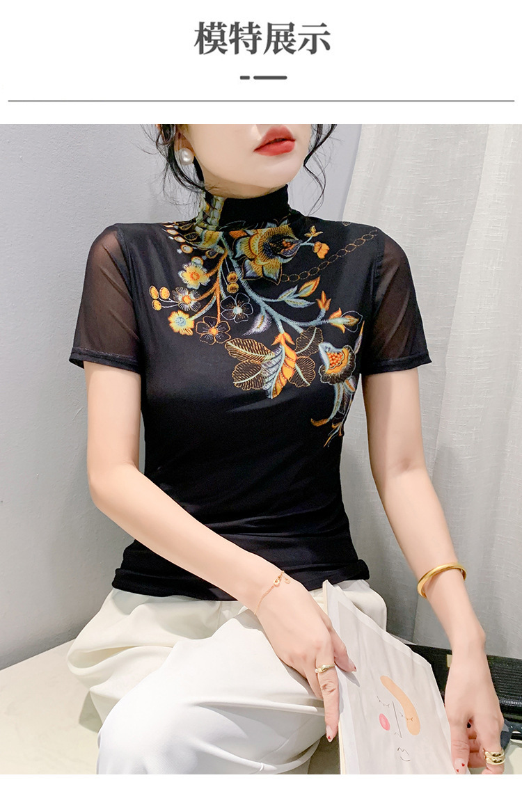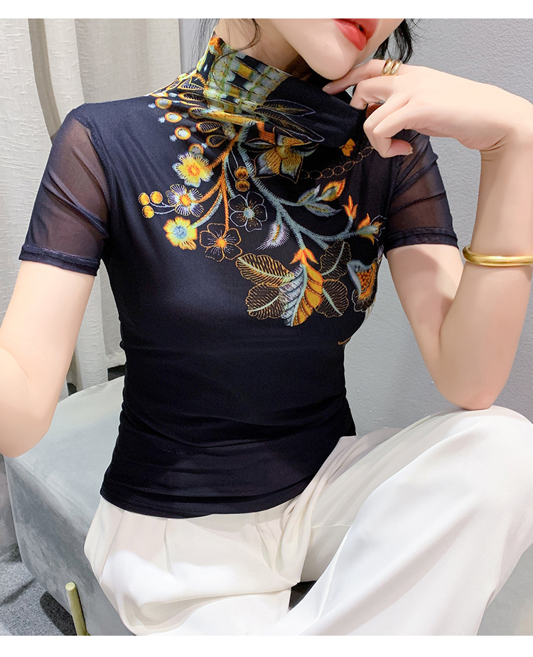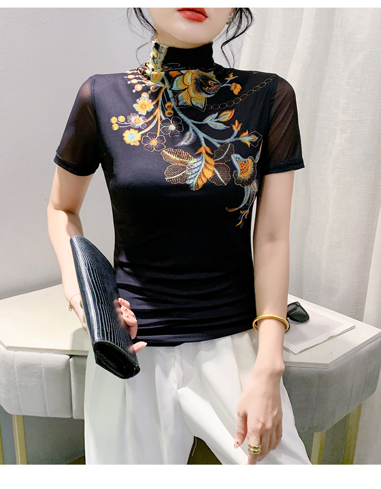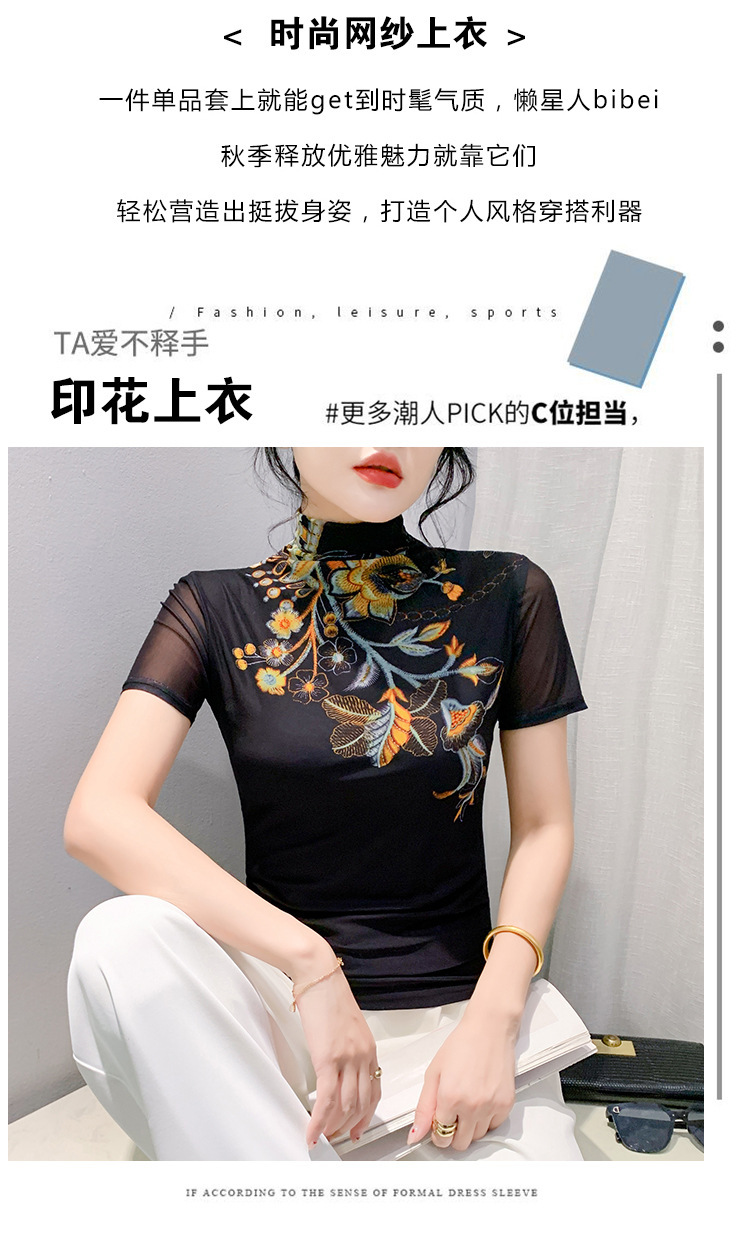 洋气半高领印花短袖网纱设计感上衣K-A55F8639
