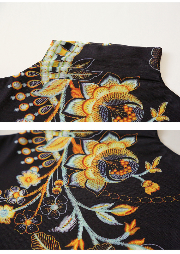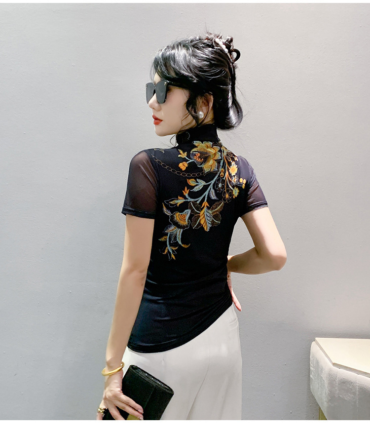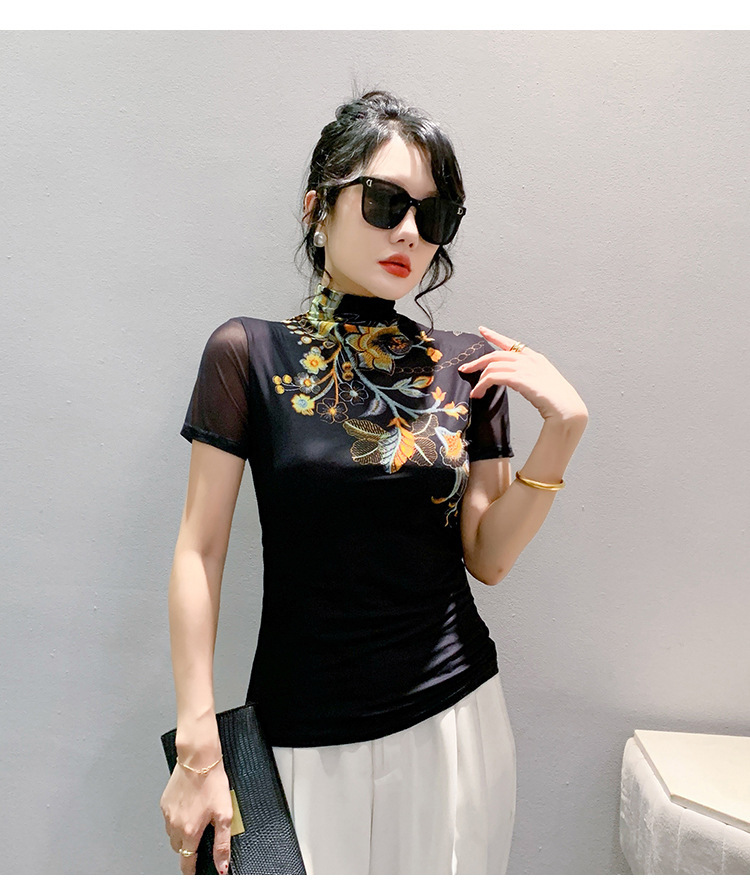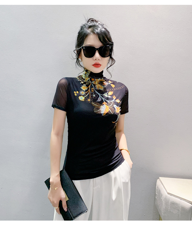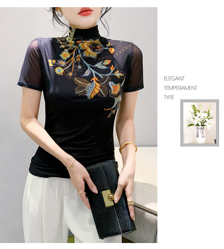洋气半高领印花短袖网纱设计感上衣K-A55F8639