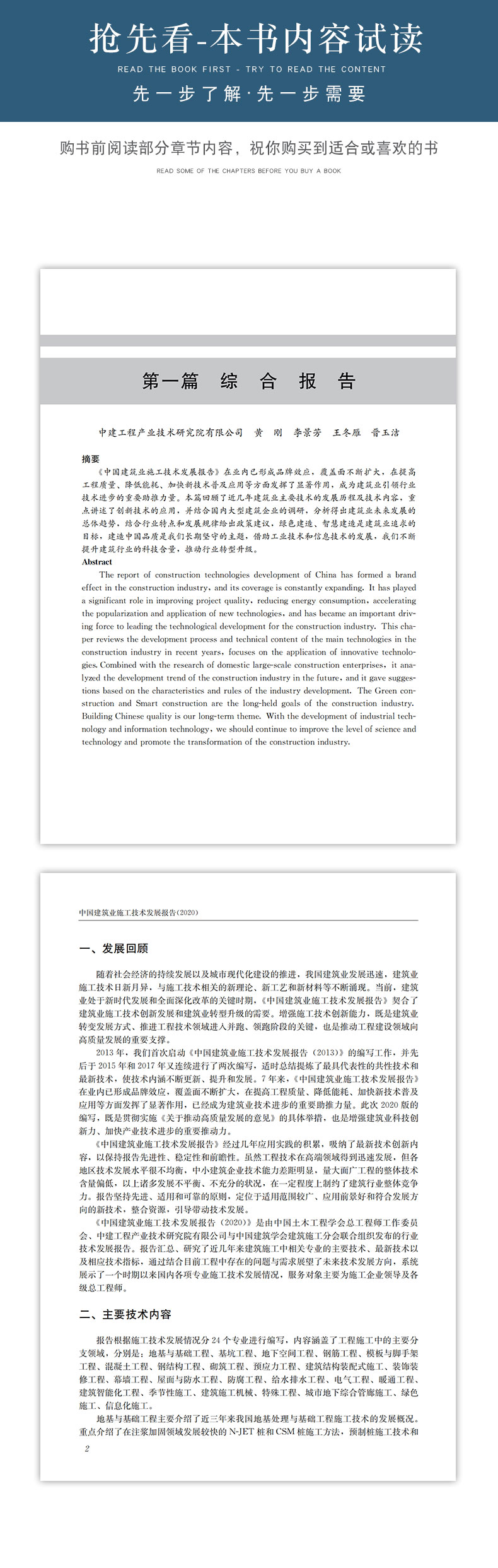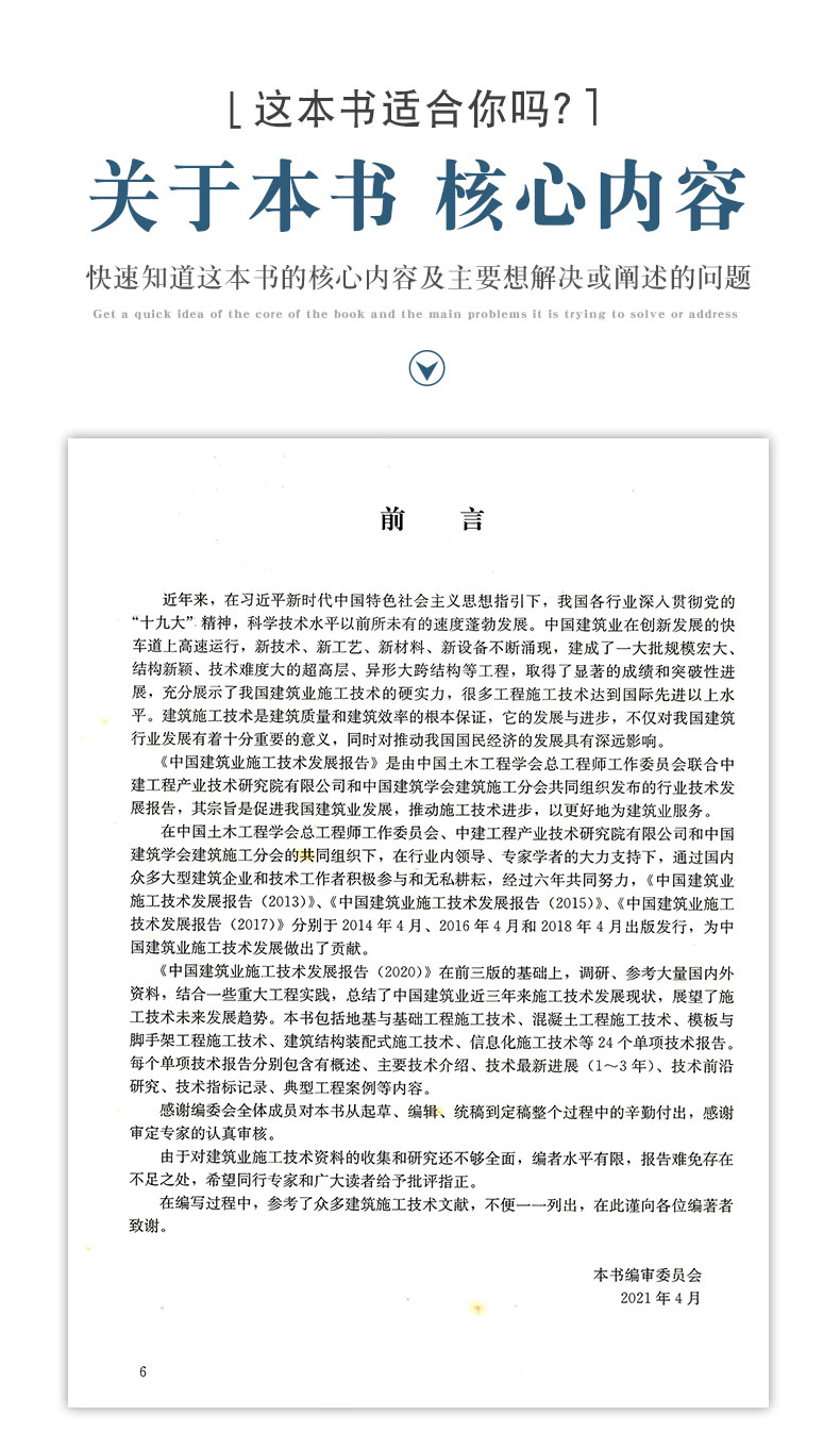 《中国建筑业施工技术发展报告2020》是由中国土木工程学会总工程师工作委员会组织发起的行业性技术发展报告,在2015年、2017年发展报告的基础上,汇总分析研究了近两年来建筑施工中相关专业的主要技术、最新技术以及相应技术指标,通过结合目前工程中存在的问题与需求展望了未来技术发展方向,系统展示了一个时期以来国内各项专业施工技术发展情况,服务对象主要为施工企业领导及各级总工程师。作为我国施工技术人员的智慧结晶,全报告内容浩瀚,深入浅出,不仅有益于广大从业人员对施工技术的全面了解和对重点技术的掌握,而且有利于最新技术的推广普及。