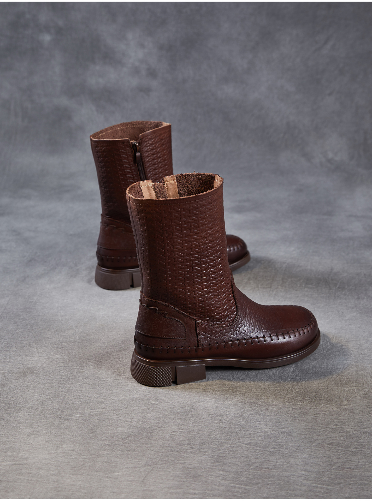 ZM 258679复古真皮压花缝制平跟软底骑士靴中筒靴 商品图0