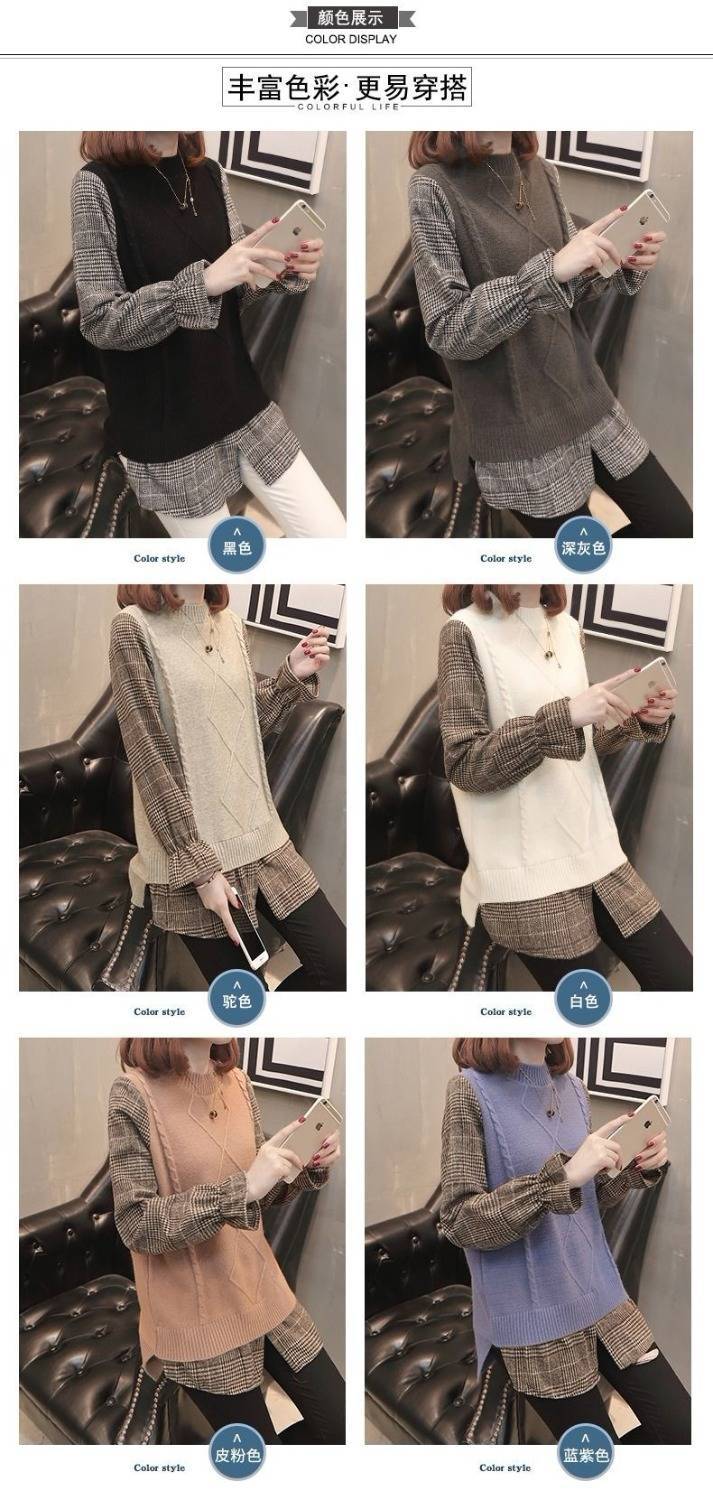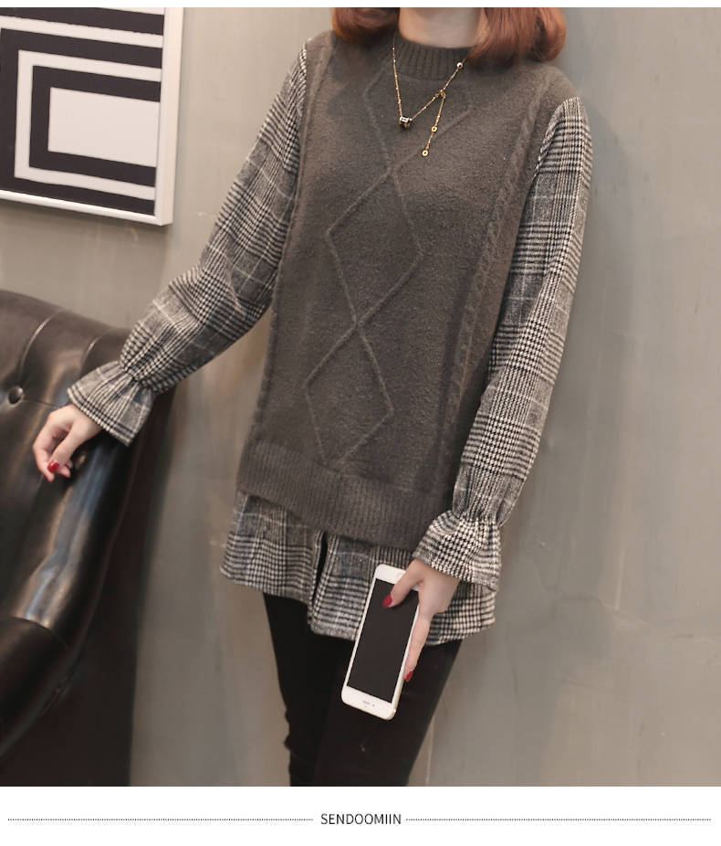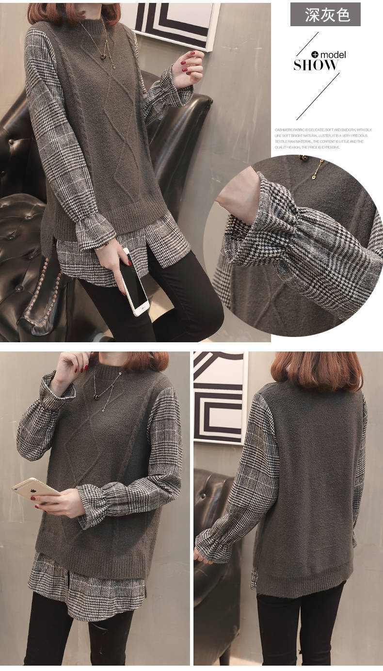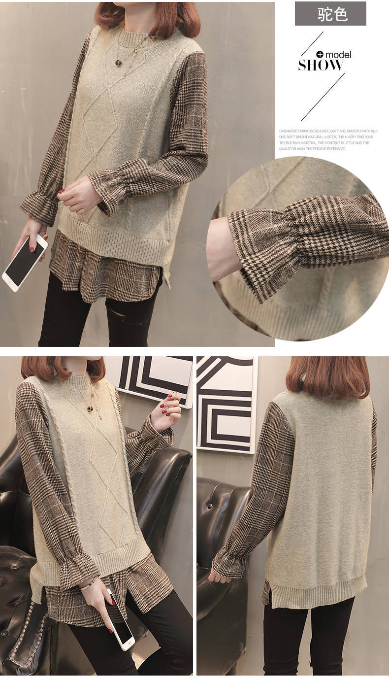喇叭袖假两件宽松圆领长袖针织衫毛衣