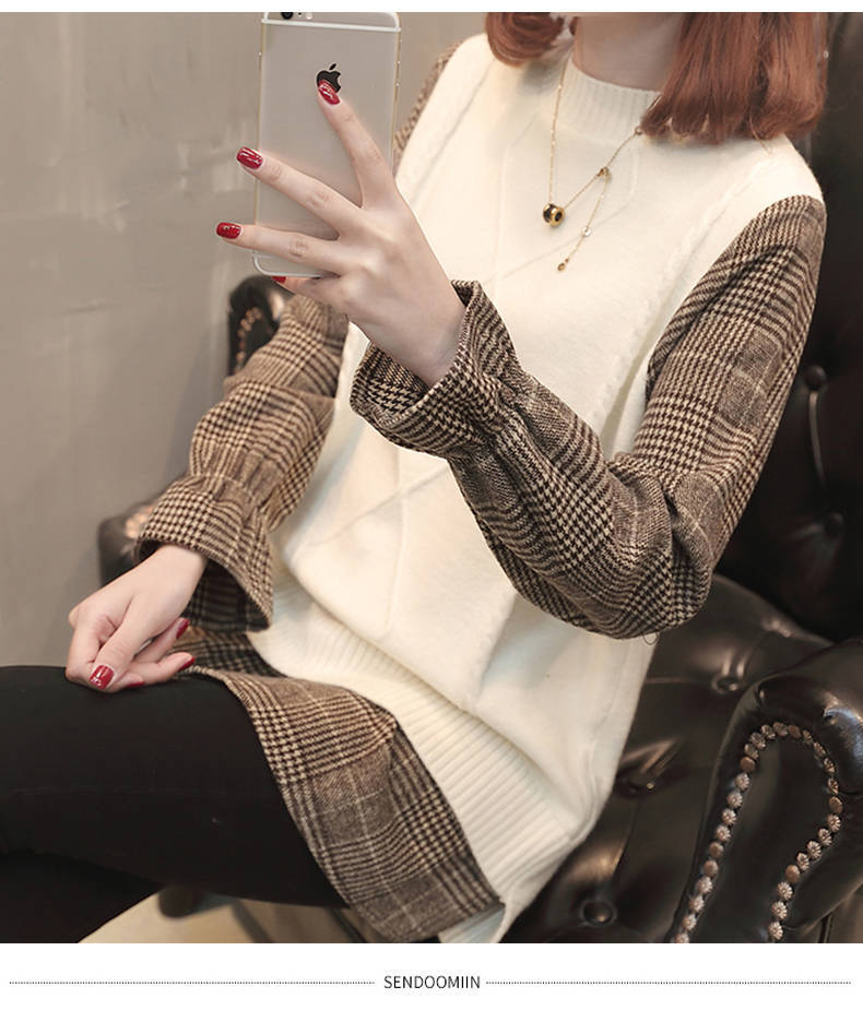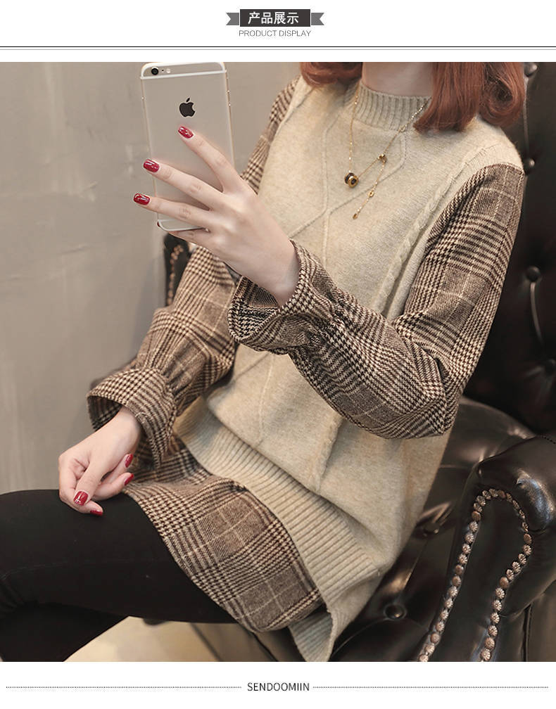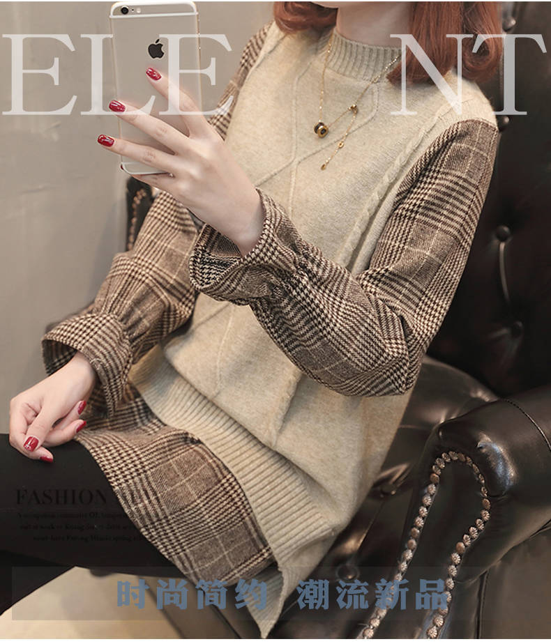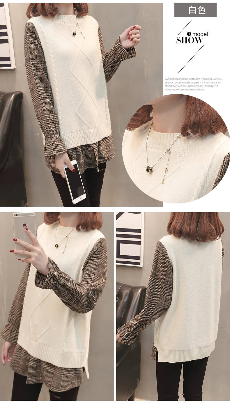 喇叭袖假两件宽松圆领长袖针织衫毛衣