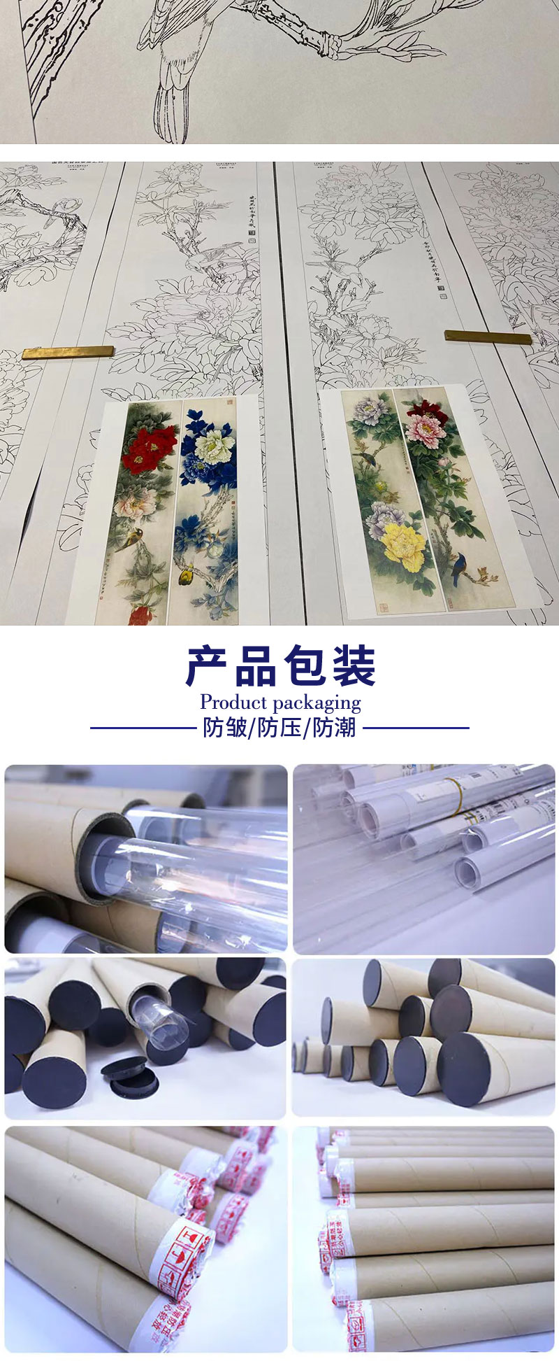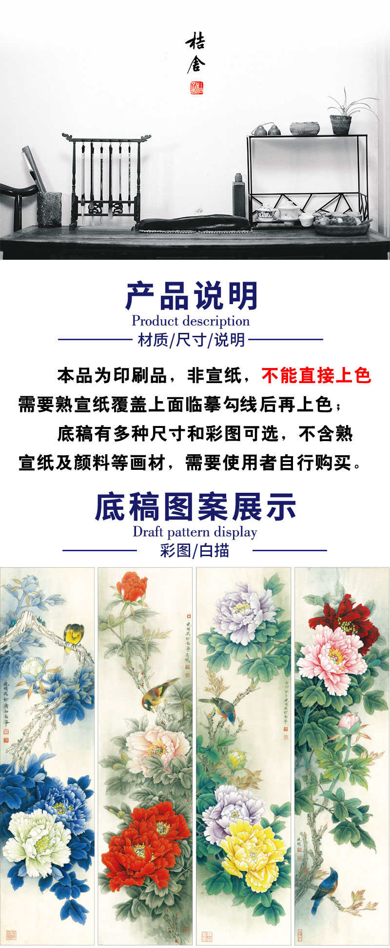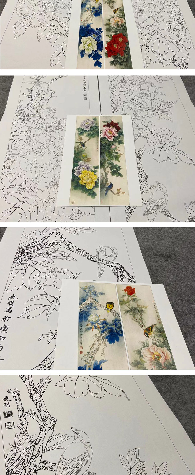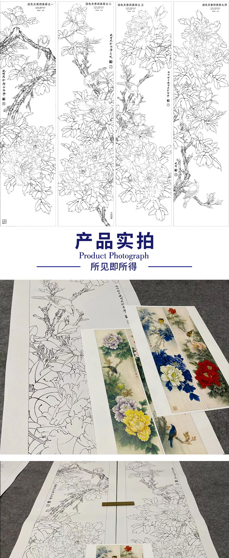 【四条屏】李晓明工笔花鸟画白描底稿《国色天香》牡丹临摹勾线花鸟线稿KA30