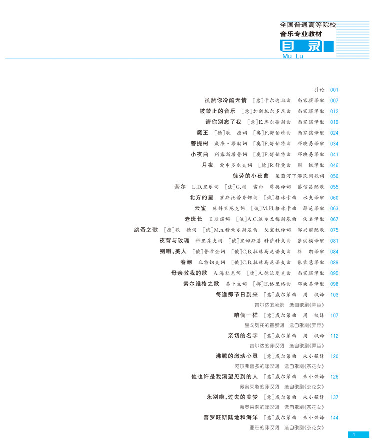 本书主要针对水平相对较高的声乐教学要求,作者从声乐(1-4)4册简谱歌曲中精心挑选了近100多首经典的外国民歌、艺术歌曲、歌剧作品,为五线谱带钢琴伴奏,所编歌曲兼顾了声乐初、中、高各级程度的教学需要。这100多首曲目分别编为2册,本书为第1册。学生通过各阶段循序渐进地学习,选择相应难度曲目进行演唱,可逐步提高其演唱能力和音乐审美与表达能力。
