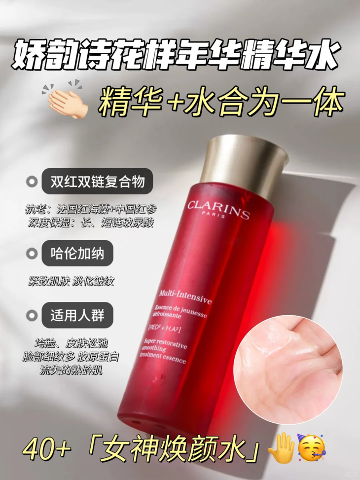 👑娇韵诗 花样年华精华水200ml 新版 ✨娇韵诗【女神精华水】精华+水合为一体! 🔥这款是为熟龄肌的姐妹研发的【主打: 补水淡纹紧致】 🌿【“双红双链”复合物+明星植萃成分】焕活年轻,深度保湿✔️ 💎如水似精华轻薄不粘腻,快速吸收💦 👍解锁轻龄肌吸收屏障提升肌肤“食欲”,促进老废角质更新,对抗皱纹、松弛✔️ ❤️适用人群:垮脸、皮肤松弛脸部细纹多 胶原蛋白流失的熟龄肌✔️