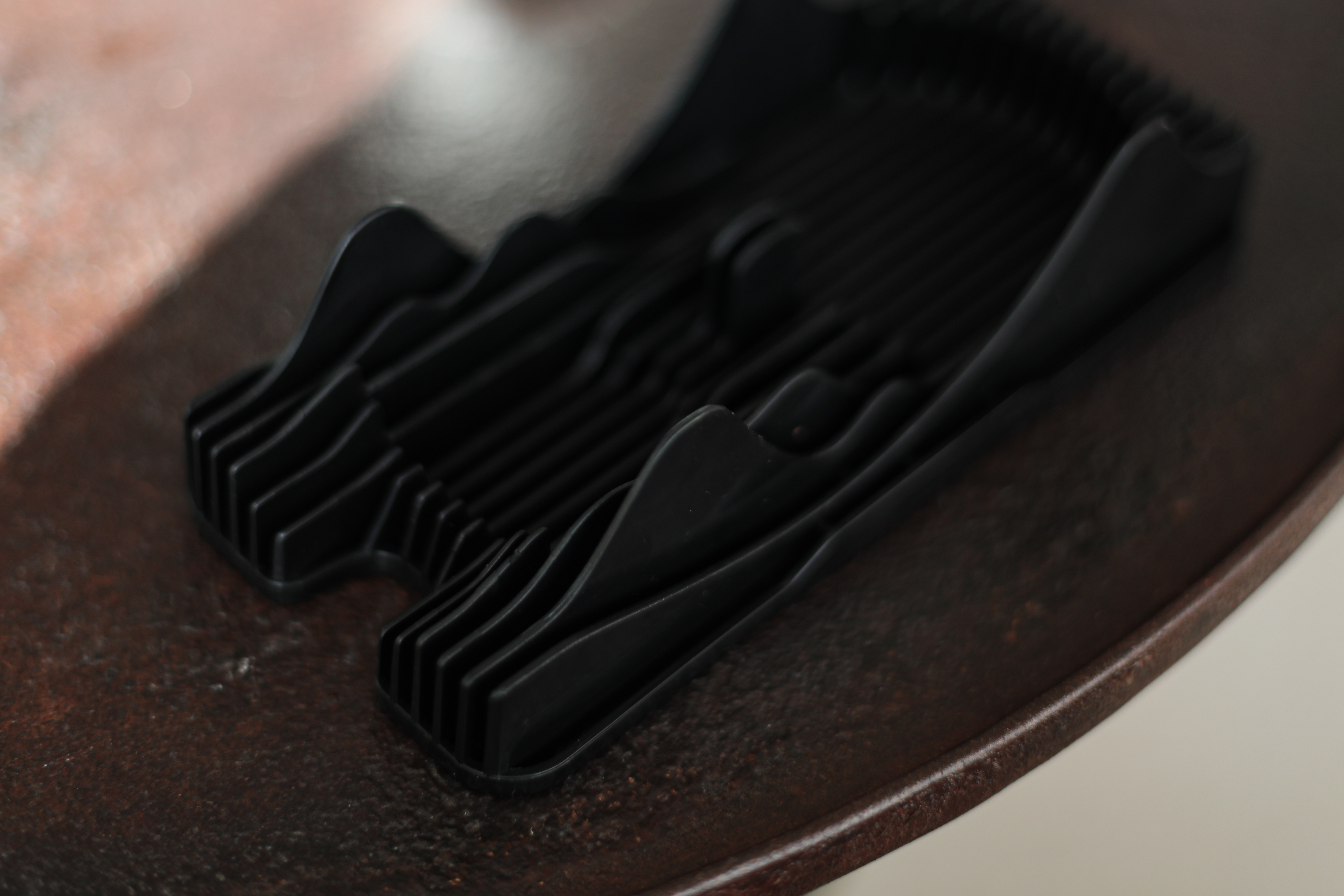 没有设计痕迹的设计在使用后发现各种小细节 整个外盒采用黑色哑光塑料结构减轻自重 结构内部是小重山型反转凹槽 茶器不差分毫的卡在上面给了满满的保护和安全感 当凹槽反转后 茶盒可以做茶海使用 近500ml的水容量够喝一整天 外盒配有弹力自粘绑带固定 布包超强防水材质耐磨损(可手提)