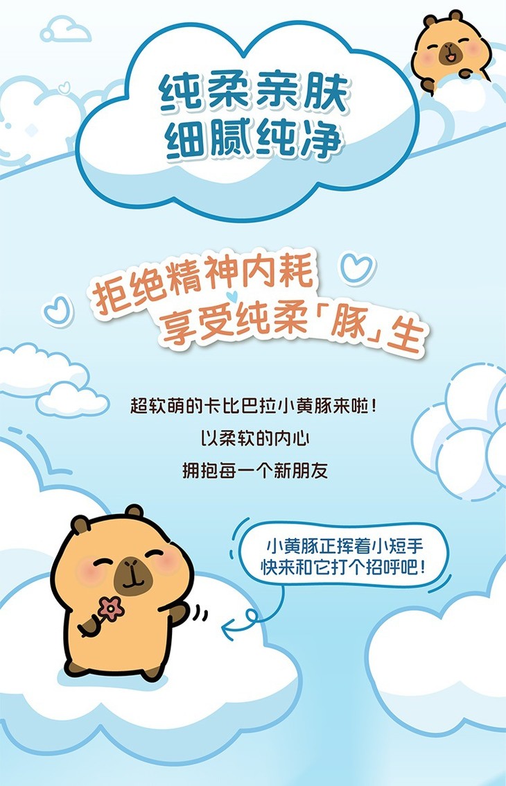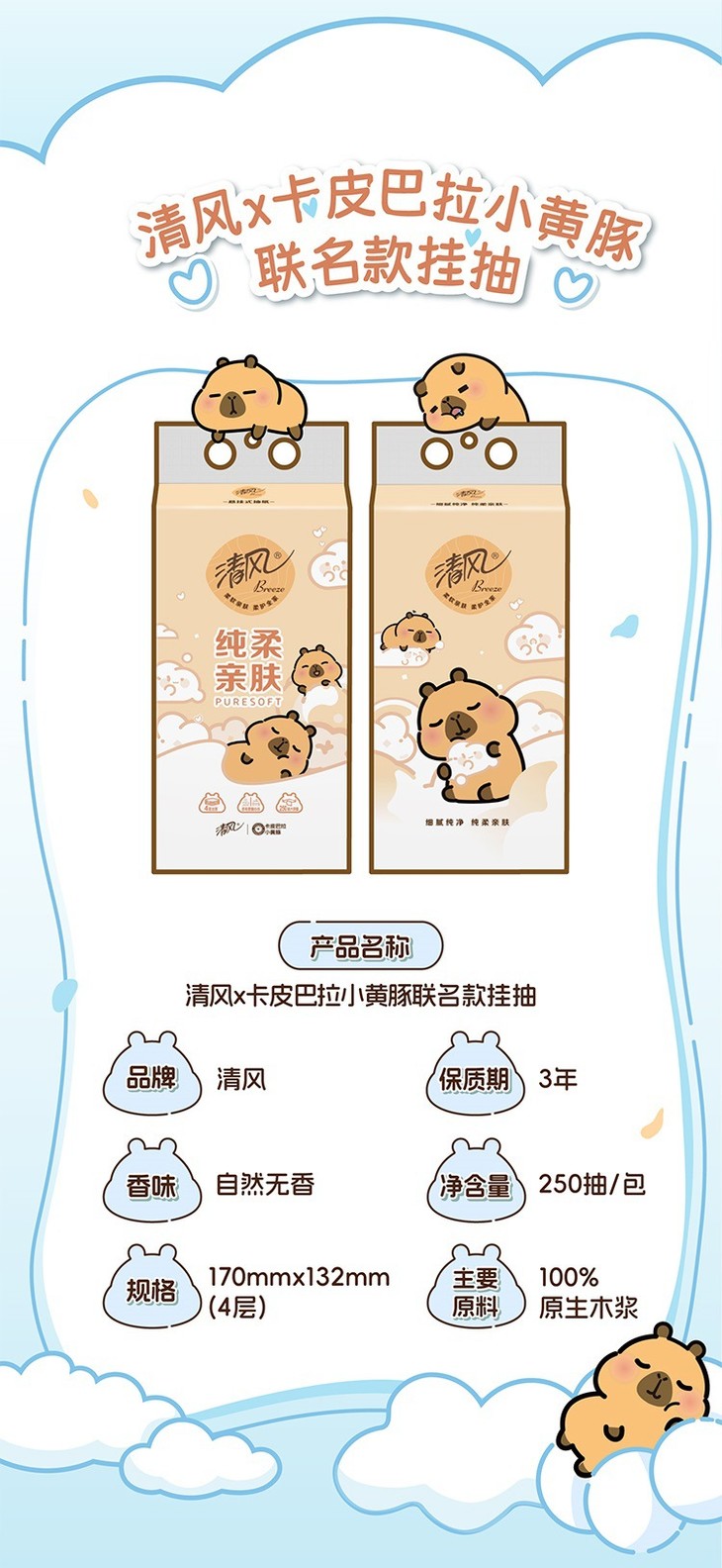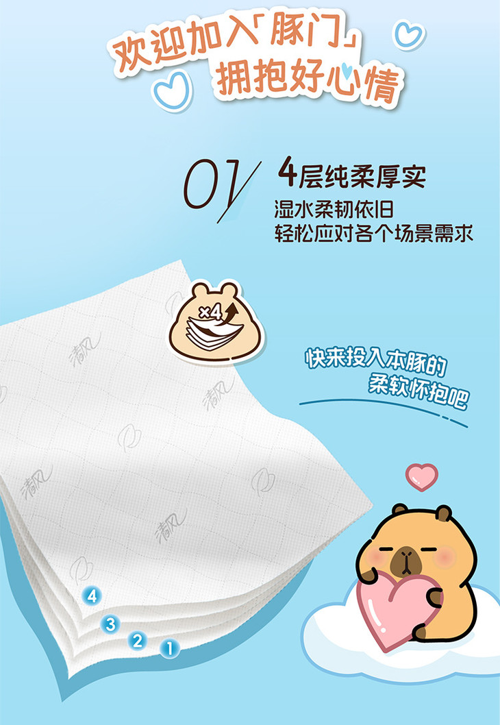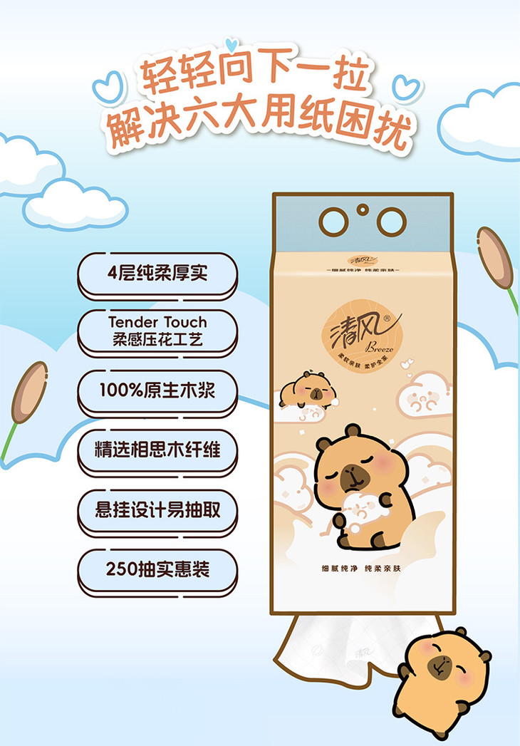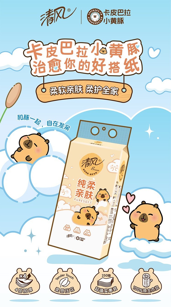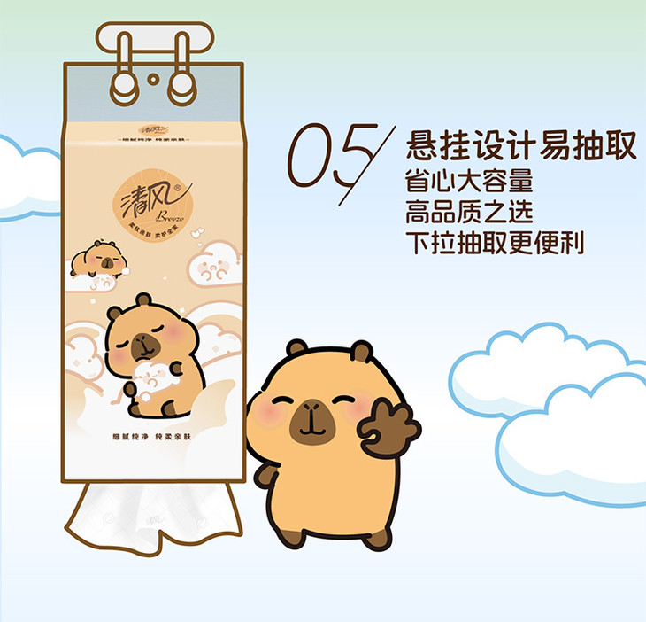 【清风】抽纸悬挂式卡皮巴拉小黄豚4层250抽*10提送挂钩 挂抽纸巾家用卫生纸餐巾纸