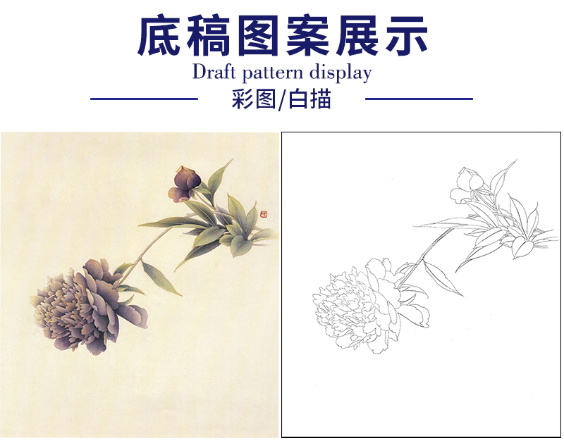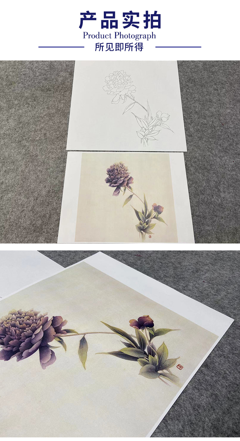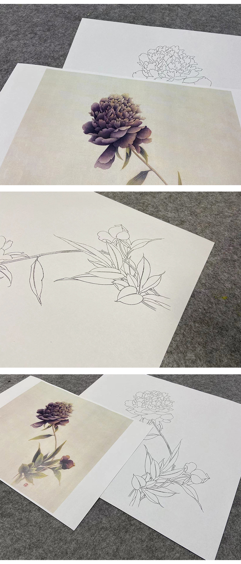 【无步骤】李长白工笔花鸟画白描底稿《芍药》斗方小品册页-LB17